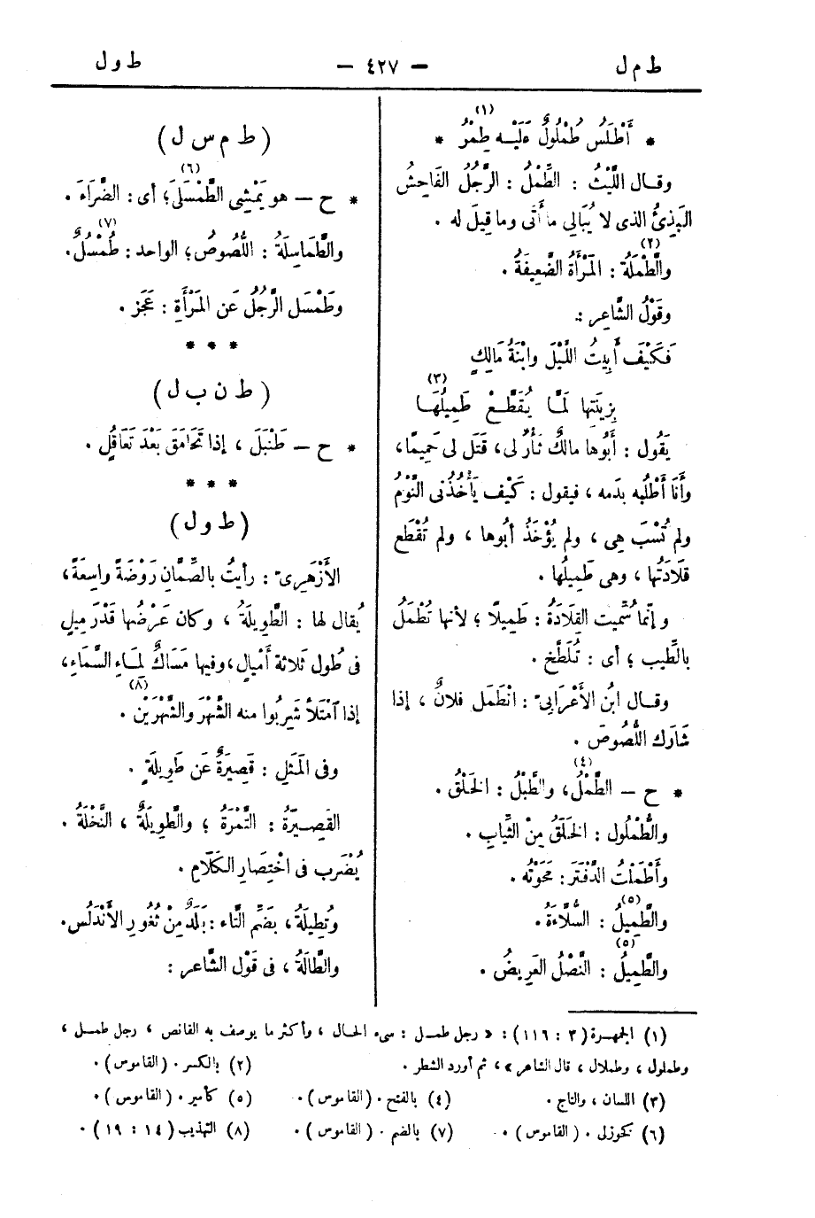 وقال اللَّيْثُ: الطِّمْلُ: الرَّجُلُ الفَاحِشُ البَذِيءُ الذي لا يُبَالِي ما أَتَى وما قِيلَ له.