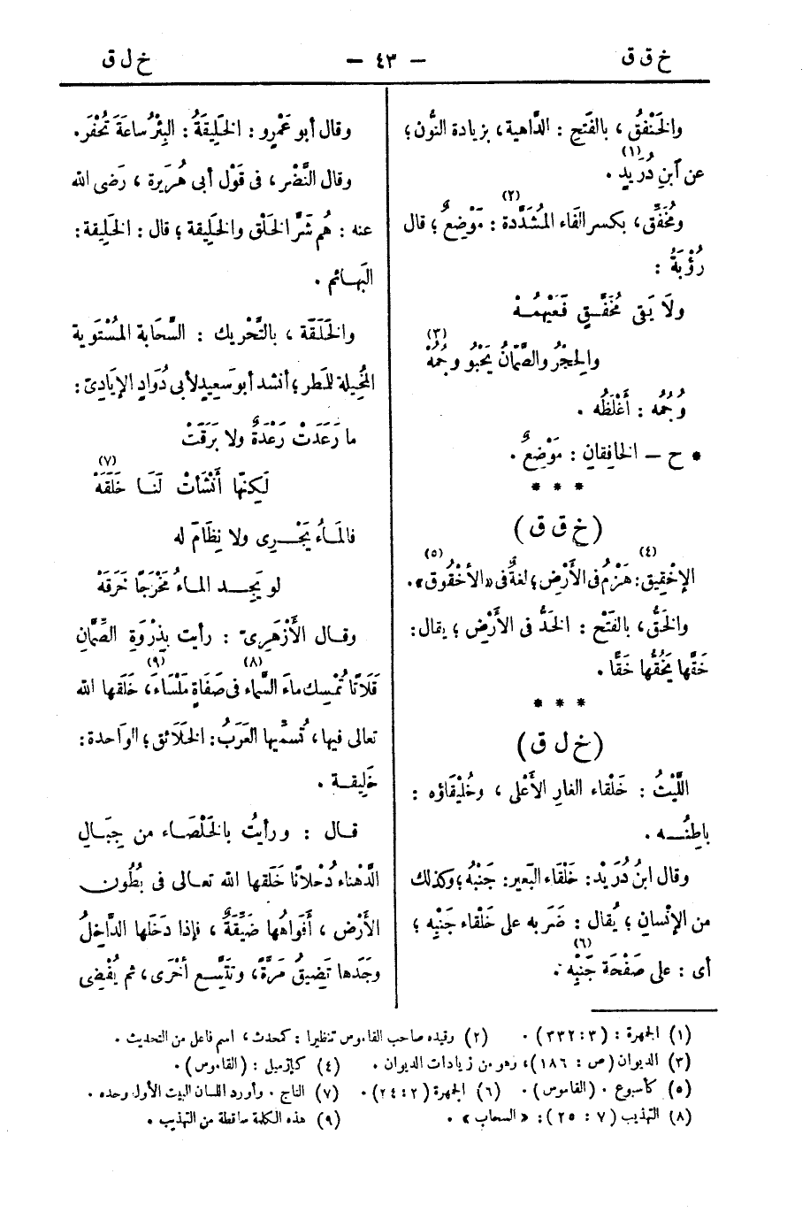 وقال النَّضْرُ في قولِ أبي هُرَيرةَ، رَضِيَ اللهُ عنه: هُمْ شَرُّ الخَلْقِ والخَلِيقةِ؛ قال: الخَلِيقةُ: البَهائِمُ.