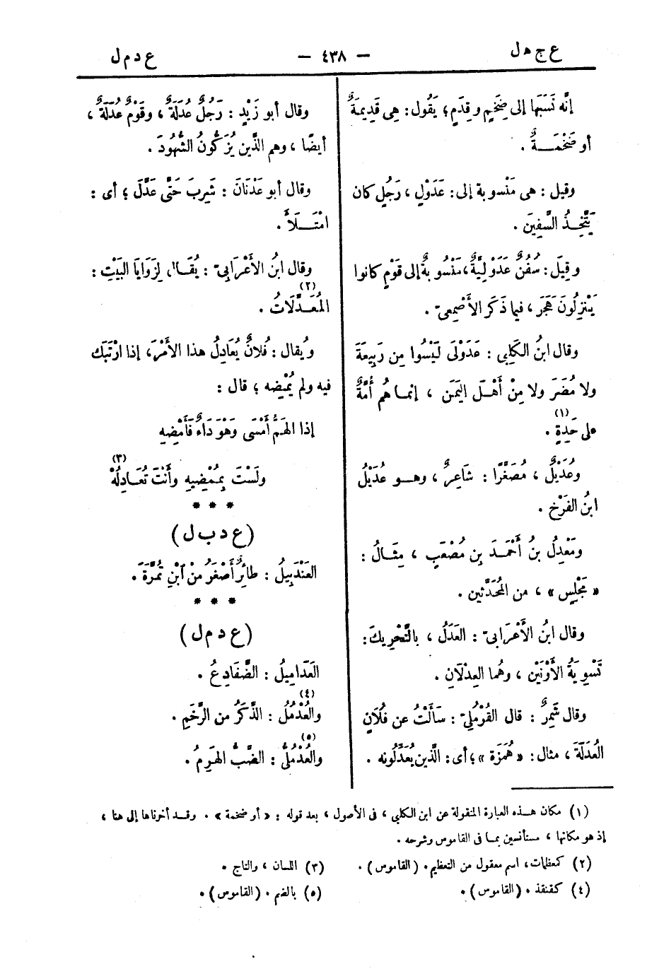وقال شَمِرٌ: قال القُرْمُلِيُّ: سَأَلْتُ عَنْ فُلانٍ العُدَلَةَ، مِثال: هُمَزَة "؛ أي: الذين يُعَدِّلُونَهُ.