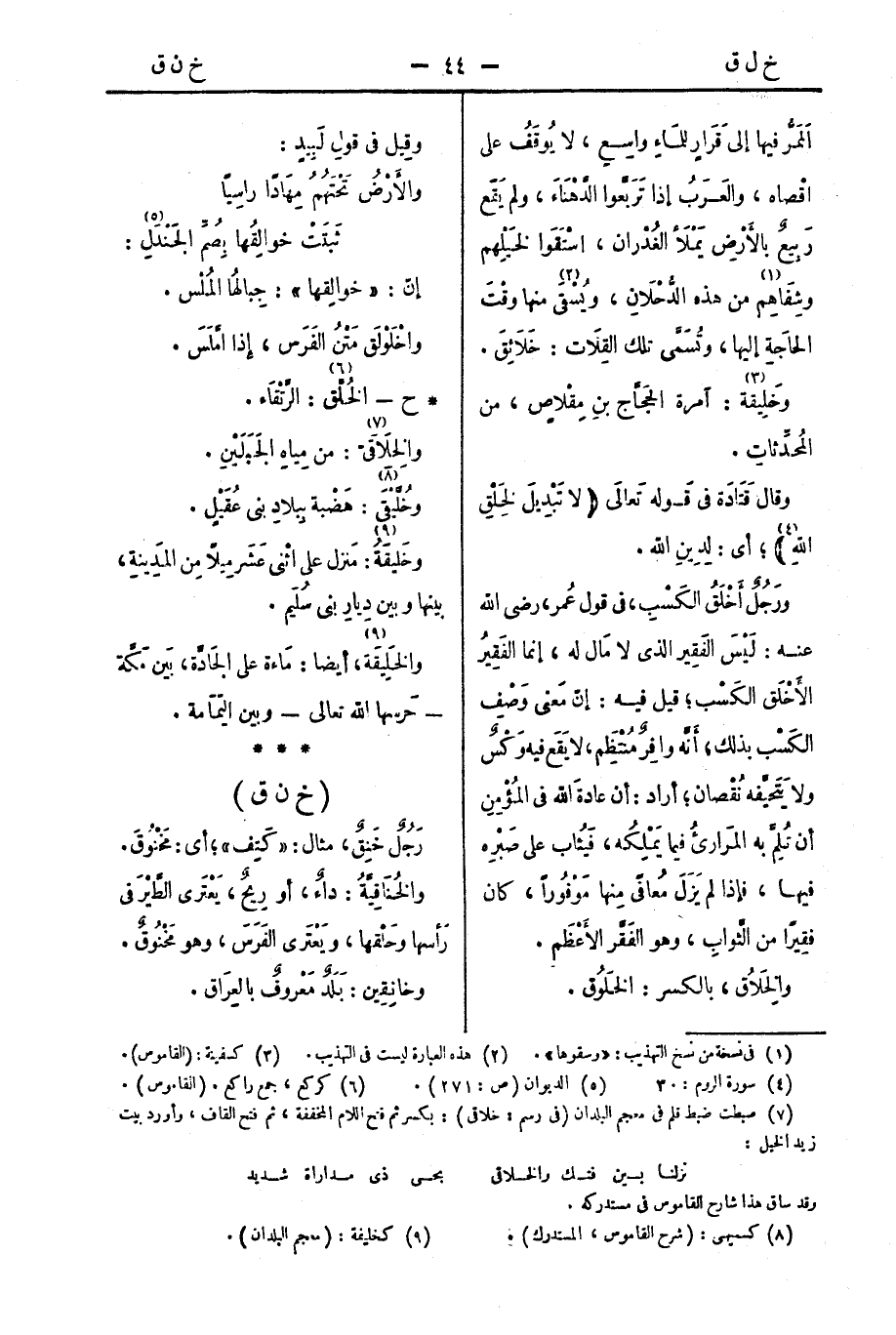 ورَجُلٌ أَخْلَقُ الكَسْبِ، في قول عُمَرَ، رضي الله عنه: لَيْسَ الفَقِيرَ الذي لا مالَ له، إنّما الفَقِيرُ الأَخْلَقُ الكَسْبِ؛ قيل فيه: إنّ مَعْنى وَصْفِ الكَسْبِ بذلك أنَّه وافِرٌ مُنْتَظِمٌ، لا يَقَعُ فيه وَكْسٌ ولا يَتَحيَّفُه نُقْصانٌ؛ أراد: أنَّ عادةَ اللهِ في المُؤْمِنِ أنْ تُلِمَّ به المَرازئُ فيما يَمْلِكُه، فيُثاب على صَبْرِه فيها، فإذا لم يَزَلْ مُعافًى منها مَوْفُورًا، كان فقِيرًا من الثَّوابِ، وهو الفَقْرُ الأَعْظَمُ.