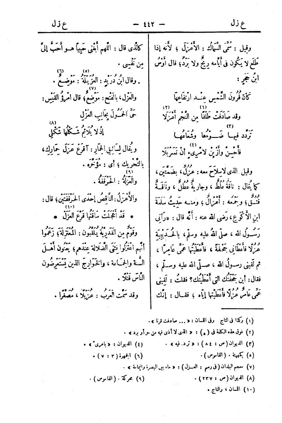 وقِيلَ: الذي لا سِلاحَ مَعَهُ: عُزُلٌ، بضَمَّتَيْنِ، كما يُقال: نَاقَةٌ عُلُطٌ، وجَارِيَةٌ عُطُلٌ، ونَاقَةٌ فُتُقٌ؛ وجَمْعُه: أَعْزَالٌ؛ ومِنْهُ حَدِيثُ سَلَمَةَ بنِ الأَكْوَعِ، رضي الله عنه: أَنَّهُ قالَ: " رَآنِي رَسُولُ اللهِ، صلى الله عليه وسلم، بالحُدَيْبِيَةِ عُزُلًا فأَعْطَانِي جَحْفَةً، فأَعْطَيْتُها عَمِّي عَامِرًا، ثُمَّ لَقِيَني رَسُولُ اللهِ، صلى الله عليه وسلم، فقالَ: أَيْنَ جَحْفَتُكَ التي أَعْطَيْتُكَ؟ فقُلْتُ: لَقِيَني عَمِّي عَامِرٌ عُزُلًا فأَعْطَيْتُها إِيَّاهُ؛ فقالَ: إنَّكَ كالَّذِي قالَ: اللَّهُمَّ أَبْغِني حَبِيبًا هُوَ أَحَبُّ إِلَيَّ مِنْ نَفْسِي ".