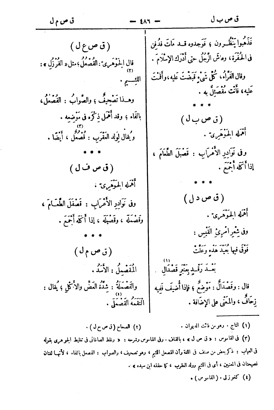 وفي نَوَادِرِ الأَعْرَابِ: قَصْفَلَ الطَّعَامَ، وقَصْمَلَهُ، وقَصْبَلَه، إذا أَكَلَه أَجْمَعَ.