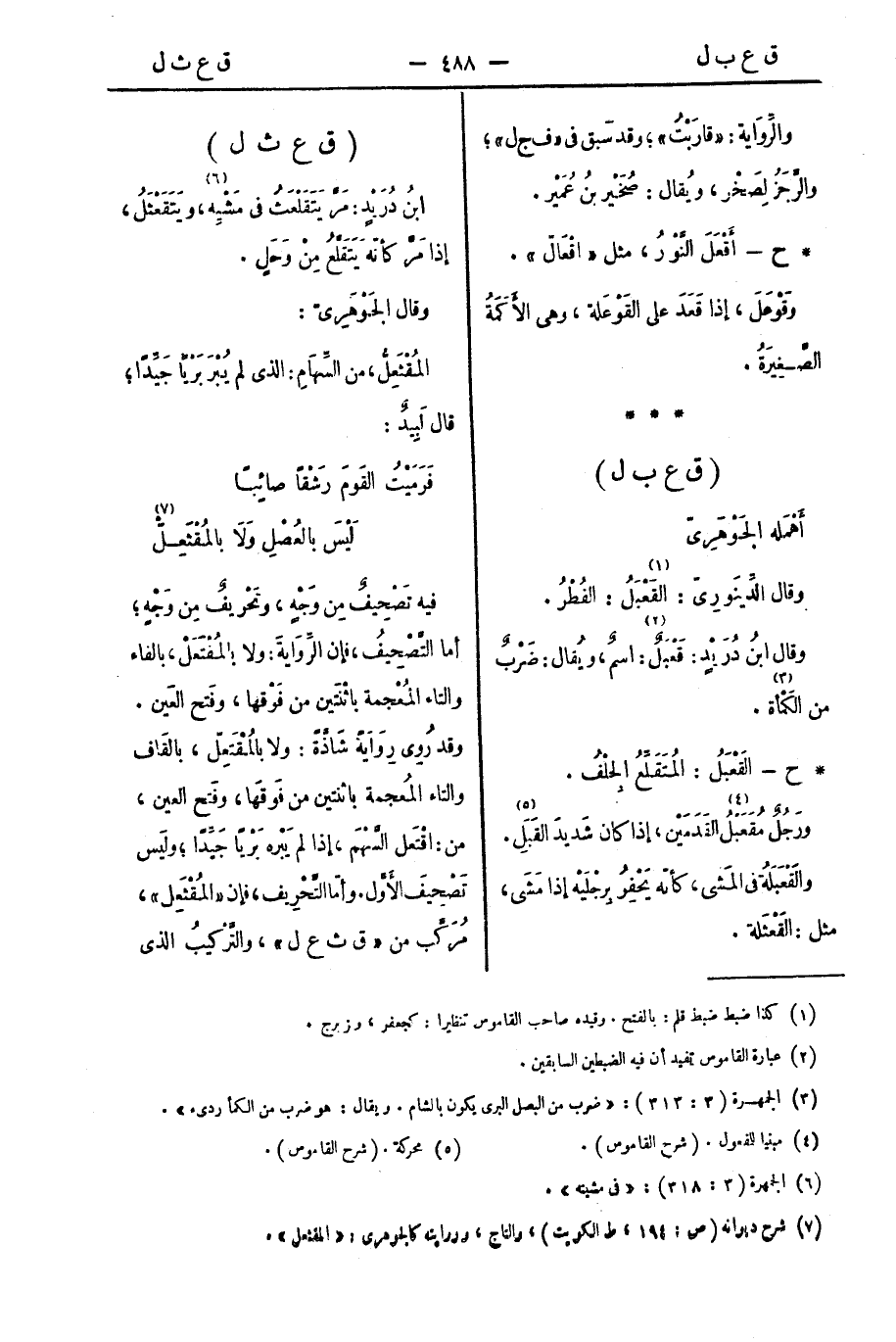 فِيه تَصْحِيفٌ مِنْ وَجْهٍ، وتَحْرِيفٌ مِنْ وَجْهٍ؛ أَمَّا التَّصْحِيفُ، فإِنَّ الرِّوَايَةَ: " ولا بالمُفْتَعَلْ "، بالفاءِ والتاءِ المُعْجَمَةِ باثْنَتَيْنِ مِنْ فَوْقِها، وفتحِ العَيْنِ. وقد رُوِيَ رِوَايَةً شَاذَّةً: " ولا بالمُقْتَعَلّْ "، بالقافِ والتاءِ المُعْجَمَةِ باثْنَتَيْنِ مِنْ فَوْقِها، وفتحِ العَيْنِ، مِن: اقْتَعَلَ السَّهْمَ، إذا لم يَبْرِه بَرْيًا جَيِّدًا؛ ولَيْسَ تَصْحِيفَ الأَوَّلِ. وأَمَّا التَّحْرِيفُ، فإنَّ " المُقْثَعِلّ " مُرَكَّبٌ مِنْ " ق ث ع ل "، والتَّرْكِيبُ الذي