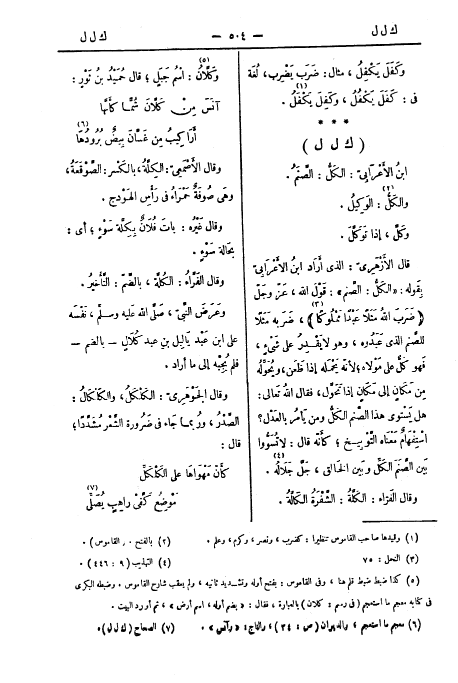 قال الأزهريُّ: الذي أَرادَ ابنُ الأعرابيِّ بقَوْلِه: " الكَلُّ: الصَّنَمُ ": قَوْلَ اللهِ، عَزَّ وجَلَّ: (ضَرَبَ اللهُ مَثَلًا عَبْدًا مَمْلُوكًا)، ضَرَبَهُ مَثَلًا لِلصَّنَمِ الذي عَبَدُوه، وهو لا يَقْدِرُ على شَيْءٍ، فهو كَلٌّ على مَوْلاه؛ لِأَنَّهُ يَحْمِلُهُ إذا ظَعَنَ، ويُحَوِّلُه مِنْ مَكَانٍ إلى مَكَانٍ إذا تَحَوَّلَ، فقالَ اللهُ تعالى: هَلْ يَسْتَوِي هذا الصَّنَمُ الكَلُّ ومَنْ يَأْمُرُ بالعَدْلِ؟ اسْتِفْهَامٌ مَعْنَاهُ التَّوْبِيخُ؛ كأَنَّهُ قالَ: لا تُسَوُّوا بَيْنَ الصَّنَمِ الكَلِّ وبَيْنَ الخَالِقِ، جَلَّ جَلالُه.