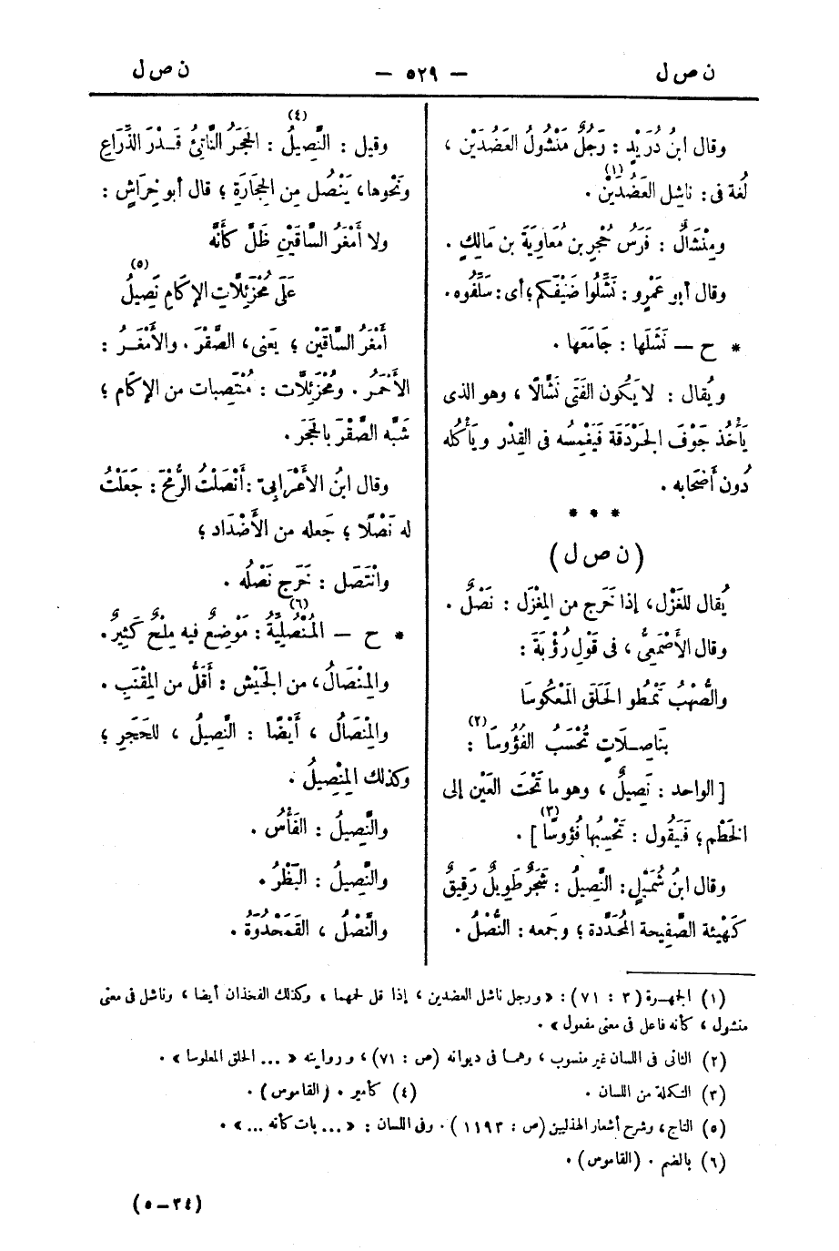 وقيل: النَّصِيلُ: الحَجَرُ النَّاتِئُ قَدْرَ الذِّرَاعِ ونَحْوِها، يَنْصُلُ مِنَ الحِجَارَةِ؛ قال أبو خِرَاشٍ:
