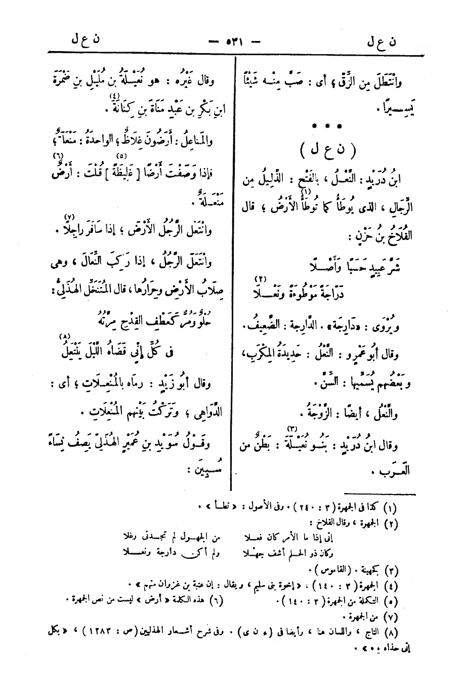 وانْتَعَلَ الرَّجُلُ، إذا رَكِبَ النِّعَالَ، وهي صِلابُ الأَرْضِ وحِرَارُها، قال المُتَنَخِّلُ الهُذَلِيُّ: