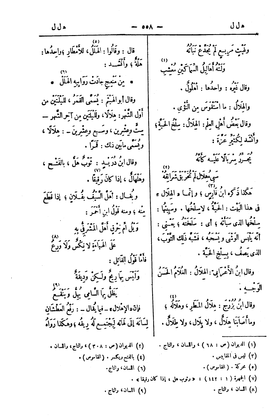 هكذا ذكرَه ابنُ فَارِسٍ؛ وإنَّما " الهِلالُ " في هذا البَيْتِ: الحَيَّةُ، لا سِلْخُها. وسَبِيئُها: سِلْخُها الذي سَبَأَتْهُ؛ أي: سَلَخَتْهُ؛ يَعْنِي: أَنَّهُ يَلْبَسُ الوَشْيَ ويَسْحَبُه، فشَبَّهَ ذلك الثَّوْبَ، الذي يَصِفُ، بِسِلْخِ الحَيَّةِ.