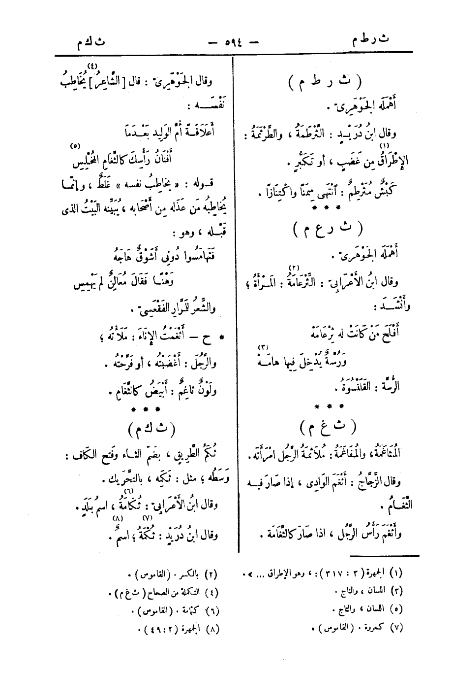 وقال ابنُ دُرَيْدٍ: الثَّرْطَمَةُ، والطَّرْثَمَةُ: الإِطْرَاقُ مِنْ غَضَبٍ، أو تَكَبُّرٍ.