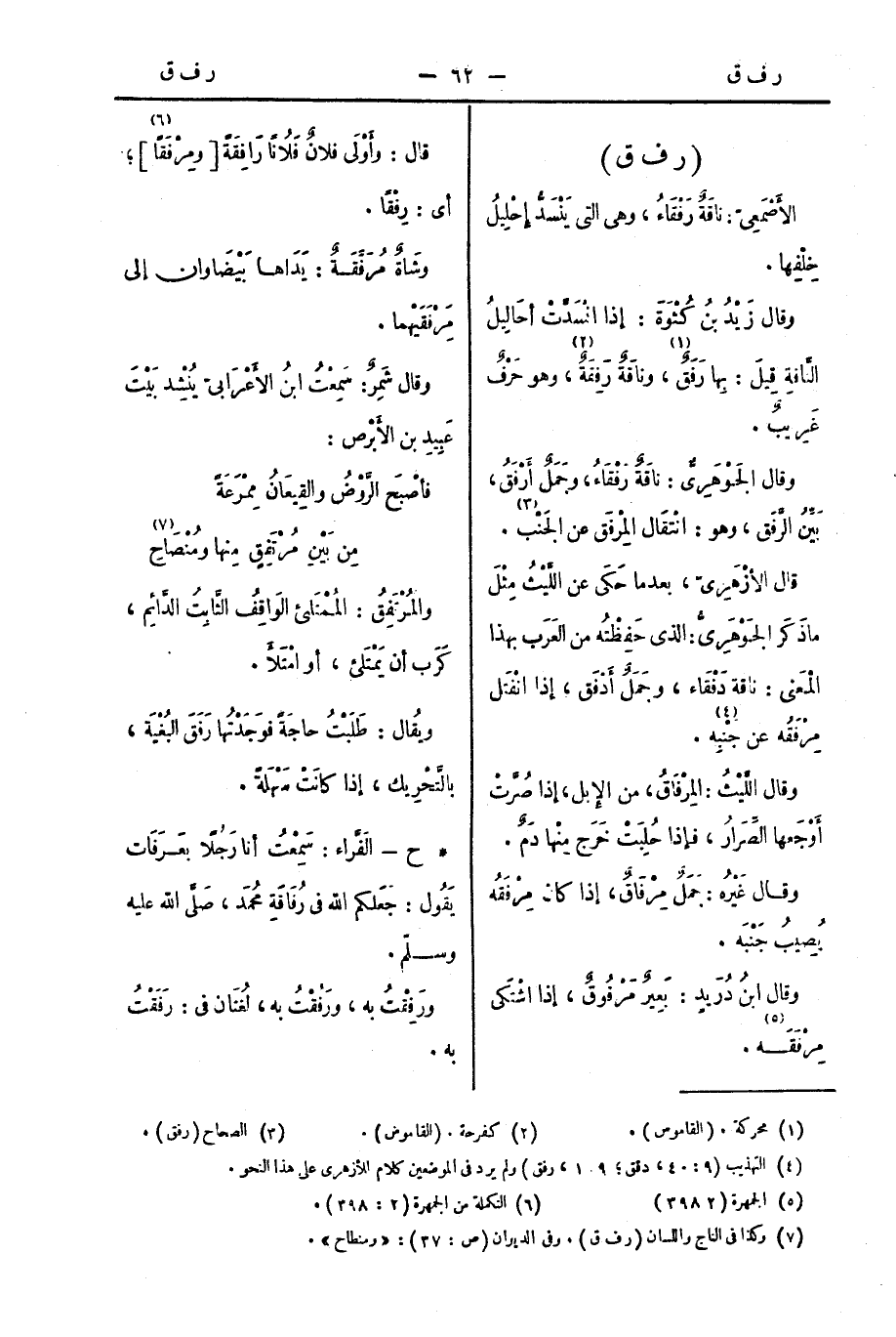 وقال اللَّيْثُ: المِرْفَاقُ، من الإبِلِ، إذا صُرَّتْ أَوْجَعَها الصِّرَارُ، فإذا حُلِبَتْ خَرَجَ مِنْها دَمٌ.