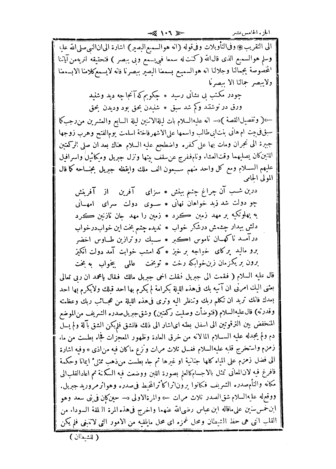 قال عليه السلام (فقمت الى جبريل فقلت أخي جبريل مالك فقال يا محمد ان ربى تعالى بعثني إليك أمرني ان آتيه بك فى هذه الليلة بكرامة لم يكرم بها أحد قبلك ولا يكرم بها أحد بعدك فانك تريد ان تكلم ربك وتنظر اليه وترى فى هذه الليلة من عجائب ربك وعظمته وقدرته) قال عليه السلام (فتوضأت وصليت ركعتين) وشق جبريل صدره الشريف من الموضع المنخفض بين الترقوتين الى أسفل بطنه اى أشار الى ذلك فانشق فلم يكن الشق بآلة ولم يسل دم ولم يجد له عليه السلام الما لانه من خرق العادة وظهور المعجزات فجاء بطست من ماء زمزم واستخرج قلبه عليه السلام فغسل ثلاث مرات ونزع ما كان فيه من أذى وفيه اشارة الى فضل زمزم على المياه كلها جنانية او غيرها ثم جاء بطست من ذهب ممتلئ ايمانا وحكمة فافرغ فيه لان المعاني تمثل بالأجسام كالعلم بصورة اللبن ووضعت فيه السكنة ثم أعاد القلب الى مكانه والتأم صدره الشريف فكانوا يرون اثرا كأثر المخيط فى صدره وهو اثر مروريد جبريل ووقع له عليه السلام شق الصدر ثلاث مرات- والمرة الاولى- حين كان فى بنى سعد وهو ابن خمس سنين على ما قاله ابن عباس رضى الله عنهما واخرج فى هذه المرة الفلقة السوداء من القلب التي هى حظ الشيطان ومحل غمزه اى محل ما يلقيه من الأمور التي لا تنبغى فلم يكن