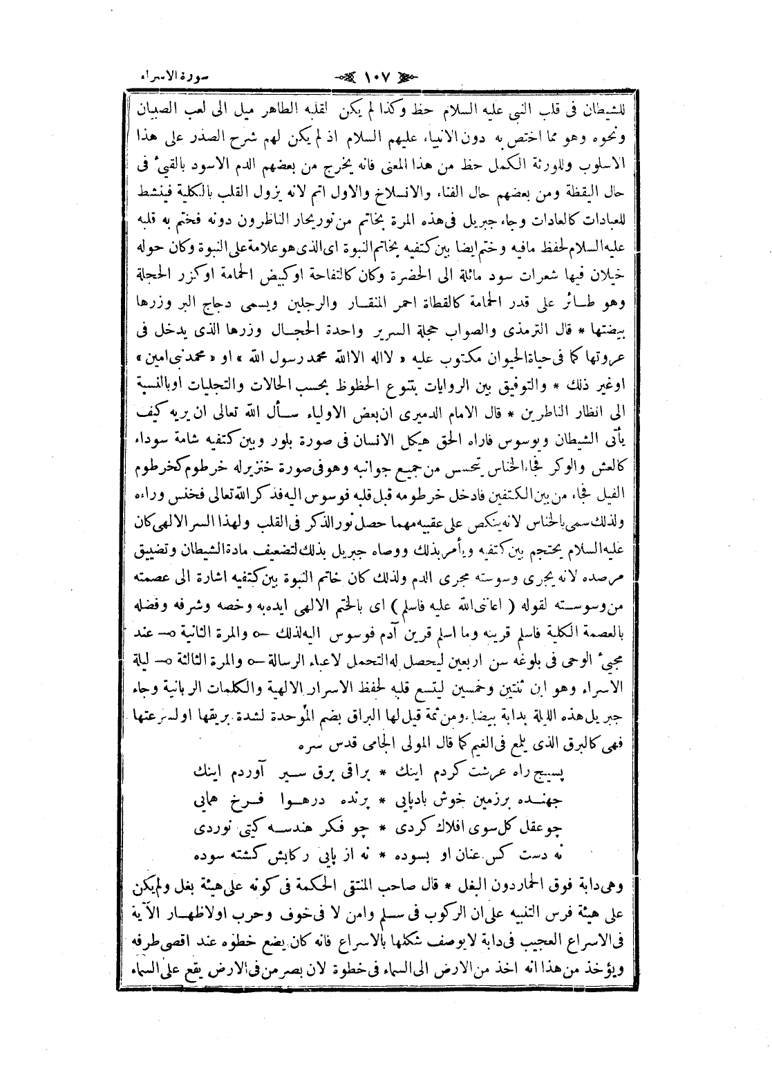 للشيطان فى قلب النبي عليه السلام حظ وكذا لم يكن لقلبه الطاهر ميل الى لعب الصبيان ونحوه وهو مما اختص به دون الأنبياء عليهم السلام إذ لم يكن لهم شرح الصدر على هذا الأسلوب وللورثة الكمل حظ من هذا المعنى فانه يخرج من بعضهم الدم الأسود بالقيء فى حال اليقظة ومن بعضهم حال الفناء والانسلاخ والاول أتم لانه يزول القلب بالكلية فينشط للعبادات كالعادات وجاء جبريل فى هذه المرة بخاتم من نور يحار الناظرون دونه فختم به قلبه عليه السلام لحفظ ما فيه وختم ايضا بين كتفيه بخاتم النبوة اى الذي هو علامة على النبوة وكان حوله خيلان فيها شعرات سود مائلة الى الحضرة وكان كالتفاحة او كبيض الحمامة او كزر الحجلة وهو طائر على قدر الحمامة كالقطاة احمر المنقار والرجلين ويسمى دجاج البر وزرها بيضتها قال الترمذي والصواب حجلة السرير واحدة الحجال وزرها الذي يدخل فى عروتها كما فى حياة الحيوان مكتوب عليه «لا اله الا الله محمد رسول الله» او «محمد نبى أمين» او غير ذلك والتوفيق بين الروايات بتنوع الحظوظ بحسب الحالات والتجليات او بالنسبة الى انظار الناظرين قال الامام الدميري ان بعض الأولياء سأل الله تعالى ان يريه كيف يأتى الشيطان ويوسوس فاراه الحق هيكل الإنسان فى صورة بلور وبين كتفيه شامة سوداء كالعش والوكر فجاء الخناس يتحسس من جميع جوانبه وهو فى صورة خنزير له خرطوم كخرطوم الفيل فجاء من بين الكتفين فادخل خرطومه قبل قلبه فوسوس اليه فذكر الله تعالى فخنس وراءه ولذلك سمى بالخناس لانه ينكص على عقبيه مهما حصل نور الذكر فى القلب ولهذا السر الإلهي كان عليه السلام يحتجم بين كتفيه ويأمر بذلك ووصاه جبريل بذلك لتضعيف مادة الشيطان وتضييق مرصده لانه يجرى وسوسته مجرى الدم ولذلك كان خاتم النبوة بين كتفيه اشارة الى عصمته من وسوسته لقوله (أعانني الله عليه فاسلم) اى بالختم الإلهي أيده به وخصه وشرفه وفضله بالعصمة الكلية فاسلم قرينه وما اسلم قرين آدم فوسوس اليه لذلك- والمرة الثانية- عند مجيئ الوحى فى بلوغه سن أربعين ليحصل له التحمل لا عباء الرسالة- والمرة الثالثة- ليلة الاسراء وهو ابن ثنتين وخمسين ليتسع قلبه لحفظ الاسرار الالهية والكلمات الربانية وجاء جبريل هذه الليلة بدابة بيضاء ومن ثمة قيل لها البراق بضم الموحدة لشدة بريقها او لسرعتها فهى كالبرق الذي يلمع فى الغيم كما قال المولى الجامى قدس سره