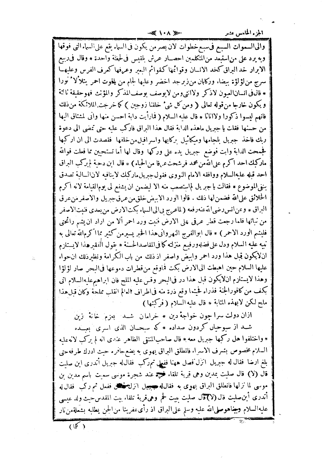والى السموات السبع فى سبع خطوات لان بصر من يكون فى السماء يقع على السماء التي فوقها وبه يرد على من استبعد من المتكلمين إحصار عرش بلقيس فى لحظة واحدة وقال فى ربيع الأبرار خد البراق كخد الإنسان وقوائمها كقوائم البعير وعرفها كعرف الفرس وعليها سرج من لؤلؤة بيضاء وركابان من زبرجد اخضر وعليها لجام من ياقوت احمر يتلألأ نورا قال فى انسان العيون لا ذكر ولا أنثى ومن لا يوصف بوصف المذكر والمؤنث فهو حقيقة ثالثة ويكون خارجا من قوله تعالى وَمِنْ كُلِّ شَيْءٍ خَلَقْنا زَوْجَيْنِ كما خرجت الملائكة من ذلك فانهم ليسوا ذكورا ولا إناثا قال عليه السلام (فما رأيت دابة احسن منها وانى لمشتاق إليها من حسنها فقلت يا جبريل ما هذه الدابة فقال هذا البراق فاركب عليه حتى تمضى الى دعوة ربك فاخذ جبريل بلجامها وميكائيل بركابها واسرافيل من خلفها فقصدت الى ان اركبها فجمحت الدابة وأبت فوضع جبريل يده على وركها وقال لها أما تستحيين مما فعلت فو الله ما ركبك أحد أكرم على الله من محمد فرشحت عرقا من الحياء) قال ابن دحية لم يركب البراق أحد قبله عليه السلام ووافقه الامام النووي فقول جبريل ما ركبك لا ينافيه لان السالبة تصدق بنفي الموضوع فقالت يا جبريل لم استصعب منه الا ليضمن ان يشفع لى يوم القيامة لانه أكرم الخلائق على الله فضمن لها ذلك. قالوا الورد الأبيض خلق من عرق جبريل والأصفر من عرق البراق وعن انس رضى الله عنه رفعه (لما عرج بي الى السماء بكت الأرض من بعدي فنبت الأصفر من نباتها فلما رجعت قطر عرقى على الأرض فنبت ورد احمر ألا من أراد ان يشم رائحتى فليشم الورد الأحمر) قال ابو الفرج النهرواني هذا الخبر يسير من كثير مما أكرم الله تعالى به نبيه عليه السلام ودل على فضله ورفيع منزلته كما فى المقاصد الحسنة يقول الفقير هذا لا يستلزم ان لا يكون قبل هذا ورد احمر وابيض واصفر إذ ذلك من باب الكرامة ونظير ذلك ان حواء عليها السلام حين أهبطت الى الأرض بكت فما وقع من قطرات دموعها فى البحر صار لؤلؤا وهذا لا يستلزم ان لا يكون قبل هذا در فى البحر وقس عليه الملح فان ابراهيم عليه السلام اتى بكف من كافور الجنة فذراه فحيثما وقع ذرة منه فى أطراف العالم انقلب مملحة وكان قبل هذا ملح لكن لا بهذه المثابة قال عليه السلام (فركبتها)