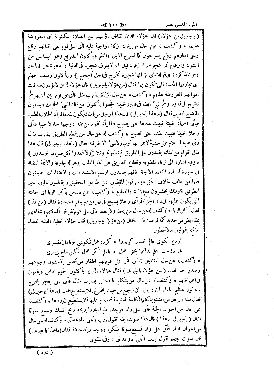 وكشف له عن حال المغتابين للناس فمر على قوم لهم اظفار من نحاس يخمشون وجوههم وصدورهم فقال (من هؤلاء يا جبريل) فقال هؤلاء الذين يأكلون لحوم الناس ويقعون فى اعراضهم وكشف له عن حال من يتكلم بالفحش بضرب مثال فأتى على حجر يخرج منه ثور عظيم فجعل الثور يريد ان يرجع من حيث يخرج فلا يستطيع فقال (ما هذا يا جبريل) فقال هذا الرجل من أمتك يتكلم الكلمة العظيمة ثم يندم عليها أفلا يستطيع ان يردها وكشف له عن حال من احوال الجنة فأتى على واد فوجده طيبا باردا ريحه ريح المسك وسمع صوتا فقال (يا جبريل ما هذا) قال هذا صوت الجنة تقول يا رب ائتنى ما وعدتني وكشف له عن حال من احوال النار فأنى على واد فسمع صوتا منكرا ووجد ريحا خبيثة فقال (ما هذا يا جبريل) قال صوت جهنم تقول يا رب ائتنى ما وعدتني: وفى المثنوى