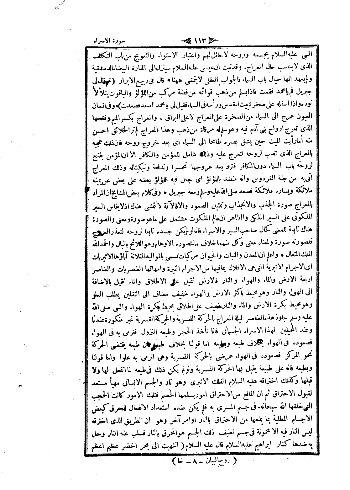 الى السماء اى بعد خروج روحه فان ذلك عجبه بالمعراج الذي نصب لروحه لتعرج عليه وذلك شامل للمؤمن والكافر الا ان المؤمن يفتح لروحه باب السماء دون الكافر فترد بعد عروجها تحسرا وندامة وتبكيتا له وذلك المعراج اتى به من جنة الفردوس وانه منضد باللؤلؤ اى جعل فيه اللؤلؤ بعضه على بعض عن يمينه ملائكة ويساره ملائكة فصعد صلى الله عليه وسلم ومعه جبريل وفى كلام بعض المشايخ ان المراد بالمعراج صورة الجذب والانجذاب وتمثيل الصعود والا فالآلة لا تتمشى هناك إذ لا يقاس السير الملكوتي على السير الملكي والظاهر ان عالم الملكوت مشتمل على ما هو صورة ومعنى الصورة هناك تابعة للمعنى كحال صاحب السير والاسراء فانه لو لم يكن جسده تابعا لروحه لتعذر العروج فلصورته صورة ولمعناه معنى وكل منهما خلاف ما تتصوره الأوهام وهو اللائح بالبال والحمد الله الملك المتعال واعلم ان المعدن والنبات والحيوان مركبات تسمى بالمواليد الثلاثة آباؤها الا ثيريات اى الاجرام الاثيرية التي هى الافلاك بما فيها من الاجرام النيرة وأمهاتها العنصريات والعناصر اربعة الأرض والماء والهواء والنار فالارض ثقيل على الإطلاق والماء ثقيل بالاضافة الى الهواء والنار وهو ميحط بأكثر الأرض والهواء خفيف مضاف الى الثقلين يطلب العلو وهو محيط بكرة الأرض والماء والنار خفيف على اطلاق يحيط بكرة الهواء والنبي صلى الله عليه وسلم جاوز هذه العناصر ليلة المعراج بالحركة القسرية والحركة القسرية غير منكورة عندنا وعند المحيلين لهذا الاسراء الجسماني فانا نأخذ الحجر وطبعه النزول فنرمى به فى الهواء فصعوده فى الهواء بخلاف طبعه وبطبعه اما قولنا بخلاف طبعه فان طبعه يقتضى الحركة نحو المركز فصعوده فى الهواء عرضى بالحركة القسرية وهى الرمي به علوا واما قولنا وبطبعه فانه على طبيعة يقبل بها الحركة القسرية ولو لم يكن ذلك فى طبعه لما انفعل لها ولا قبلها وكذلك اختراقه عليه السلام الفلك الاثيرى وهو نار والجسم الإنساني مهيأ مستعد لقبول الاحتراق ثم ان المانع من الاحتراق امور يسلمها الخصم فتلك الأمور كانت الحجب التي خلقها الله سبحانه فى جسم المسرى به فلم يكن عنده استعداد الانفعال للحرق كبعض الأجسام المطلية بما يمنعها من الاحتراق بالنار او امر آخر وهو ان الطريق الذي اخترقه ليس النار فيه الا محمولة فى جسم لطيف ذلك الجسم هو المحرق بالنار فسلب عنه النار وحل به ضدها كنار ابراهيم عليه السلام قال عليه السلام (انتهيت الى بحر اخضر عظيم أعظم