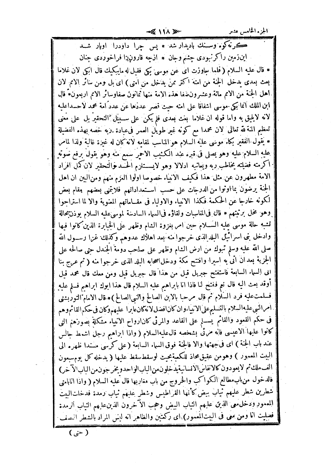 قال عليه السلام (فلما جاوزت اى عن موسى بكى فقيل له ما يبكيك قال ابكى لان غلاما بعث بعدي يدخل الجنة من أمته اكثر ممن يدخل من أمتي) اى بل ومن سائر الأمم لان اهل الجنة من الأمم مائة وعشرون صفا هذه الامة منها ثمانون صفا وسائر الأمم أربعون قال ابن الملك انما بكى موسى إشفاقا على أمته حيث قصر عددها عن عدد امة محمد لا حسدا عليه لانه لا يليق به واما قوله ان غلاما بعث بعدي فلم يكن على سبيل التحقير بل على معنى تعظيم المنة لله تعالى لان محمدا مع كونه غير طويل العمر فى عبادة ربه خصه بهذه الفضيلة يقول الفقير بكاء موسى عليه السلام هو المناسب لمقامه لانه كان له غيرة غالبة ولذا لما مر عليه السلام عليه وهو يصلى فى قبره عند الكثيب الأحمر سمع منه وهو يقول برفع صوته أكرمته فضلته يخاطب ربه ويعاتبه إدلالا وهو لا يستلزم الحسد والتحقير لان كمل افراد الامة مطهرون عن مثل هذا فكيف الأنبياء خصوصا أولوا العزم منهم ومن البين ان اهل الجنة يرضون بما أوتوا من الدرجات على حسب استعداداتهم فلا يتمنى بعضهم مقام بعض لكونه خارجا عن الحكمة فكذا الأنبياء والأولياء فى مقاماتهم المعنوية والا لما استراحوا وهو مخل برتبتهم قال فى المناسبات ولقاؤه فى السماء السادسة لموسى عليه السلام يوذن بحالة تشبه حالة موسى عليه السلام حين امر بغزوة الشام وظهر على الجبابرة الذين كانوا فيها وادخل بنى إسرائيل البلد الذي خرجوا منه بعد إهلاك عدوهم وكذلك غزا رسول الله صلى الله عليه وسلم تبوك من ارض الشام وظهر على صاحب دومة الجندل حتى صالحه على الجزية بعد ان اتى به أسيرا وافتتح مكة ودخل أصحابه البلد الذي خرجوا منه (ثم عرج بنا الى السماء السابعة فاستفتح جبريل قيل من هذا قال جبريل قيل ومن معك قال محمد قيل أوقد بعث اليه قال نعم ففتح لنا فاذا انا بإبراهيم عليه السلام قال هذا أبوك ابراهيم فسلم عليه فسلمت عليه فرد السلام ثم قال مرحبا بالابن الصالح والنبي الصالح) قال الامام التور بشتى امر النبي عليه السلام بالتسليم على الأنبياء وان كان أفضل لانه كان عابرا عليهم وكان فى حكم القائم وهم فى حكم القعود والقائم يسلم على القاعد والمرئي كان أرواح الأنبياء مشكلة بصورهم التي كانوا عليها الا عيسى فانه مرئى بشخصه قال عليه السلام (وإذا ابراهيم رجل اشمط جالس عند باب الجنة) اى فى جهتها والا فالجنة فوق السماء السابعة (على كرسى مسندا ظهره الى البيت المعمور) وهو من عقيق محاذ للكعبة بحيث لو سقط سقط عليها (يدخله كل يوم سبعون الف ملك ثم لا يعودون كالانفاس الانسانية يدخلون من الباب الواحد ويخرجون من الباب الآخر) فالدخول من باب مطالع الكواكب والخروج من باب مغاربها قال عليه السلام (وإذا انا بامتى شطرين شطر عليهم ثياب بيض كأنها القراطيس وشطر عليهم ثياب رمدة فدخلت البيت المعمور ودخل معى الذين عليهم الثياب البيض وحجب الآخرون الذين عليهم الثياب الرمدة فصليت انا ومن معى فى البيت المعمور) اى ركعتين والظاهر انه ليس المراد بالشطر النصف