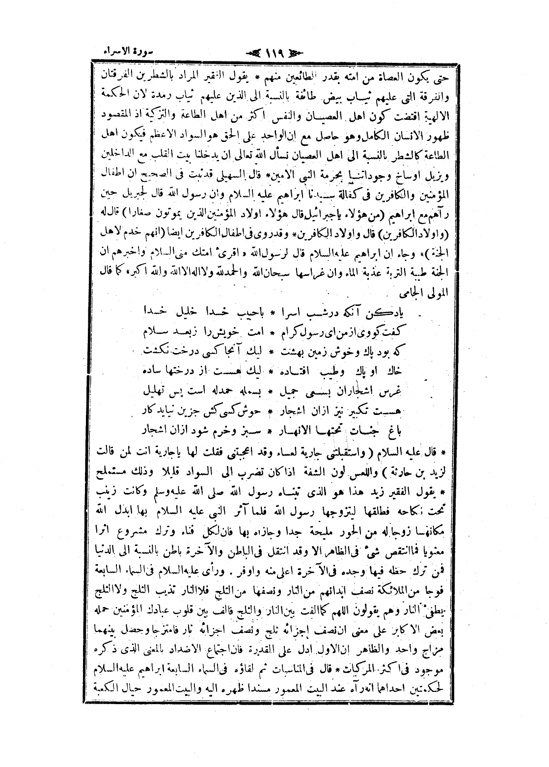 قال عليه السلام (واستقبلتني جارية لعساء وقد أعجبتني فقلت لها يا جارية أنت لمن قالت لزيد بن حارثة) واللعس لون الشفة إذا كان تضرب الى السواد قليلا وذلك مستملح يقول الفقير زيد هذا هو الذي تبناه رسول الله صلى الله عليه وسلم وكانت زينب تحت نكاحه فطلقها ليتزوجها رسول الله فلما آثر النبي عليه السلام بها أبدل الله مكانها زوجا له من الحور مليحة جدا وجازاه بها فان لكل فناء وترك مشروع اثرا معنويا فما انتقص شىء فى الظاهر الا وقد انتقل فى الباطن والآخرة باطن بالنسبة الى الدنيا فمن ترك حظه فيها وجده فى الآخرة أعلى منه وأوفر. ورأى عليه السلام فى السماء السابعة فوجا من الملائكة نصف أبدانهم من النار ونصفها من الثلج فلا النار تذيب الثلج ولا الثلج يطفئ النار وهم يقولون اللهم كما الفت بين النار والثلج فالف بين قلوب عبادك المؤمنين حمله بعض الأكابر على معنى ان نصف اجزائه ثلج ونصف اجزائه نار فامتزجا وحصل بينهما مزاج واحد والظاهر ان الاول ادل على القدرة فان اجتماع الاضداد بالمعنى الذي ذكره موجود فى اكثر المركبات قال فى المناسبات ثم لقاؤه فى السماء السابعة ابراهيم عليه السلام لحكمتين إحداهما انه رآه عند البيت المعمور مسندا ظهره اليه والبيت المعمور حيال الكعبة