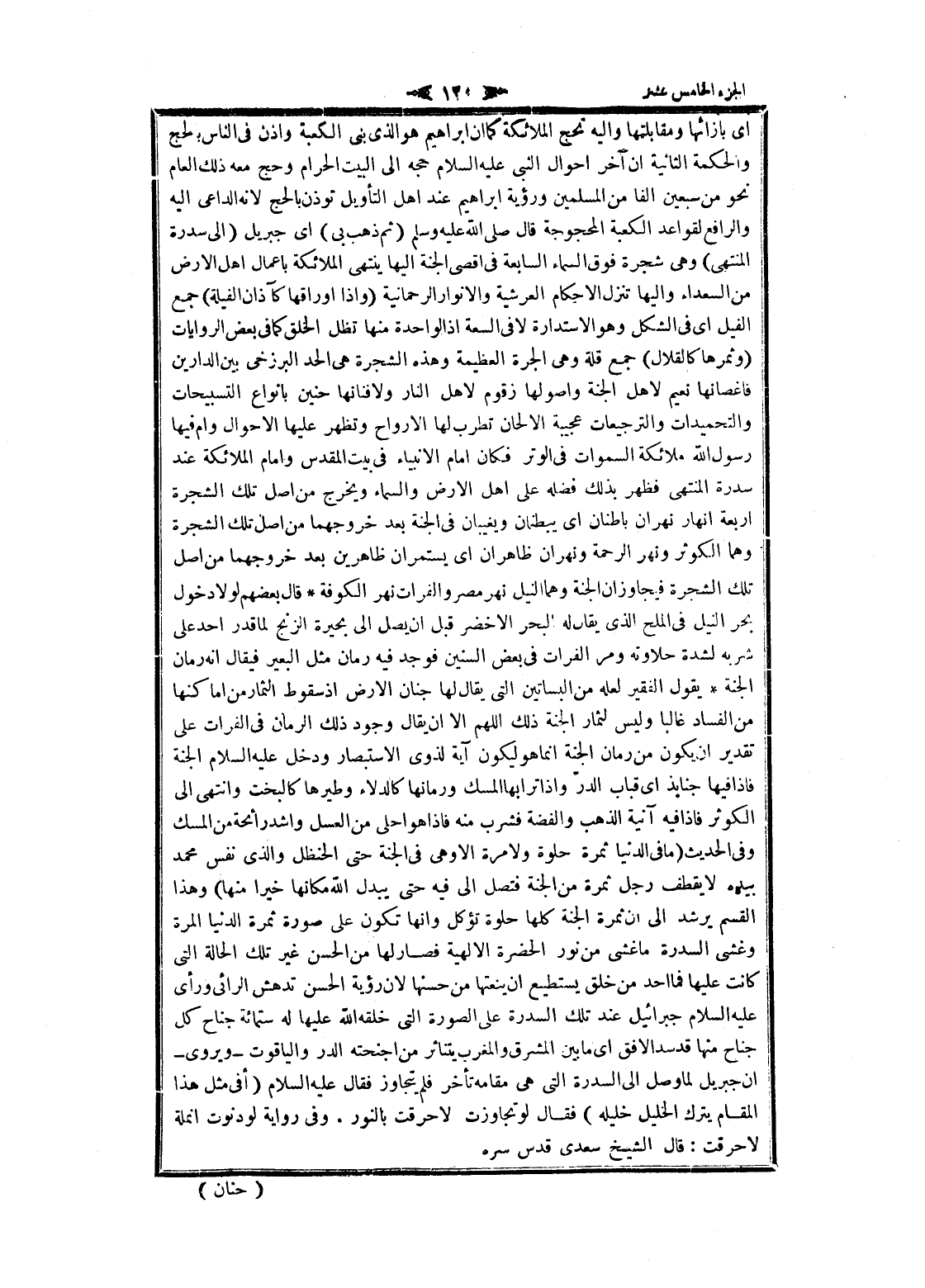 عند تلك السدرة على الصورة التي خلقه الله عليها له ستمائة جناح كل جناح منها قد سد الأفق اى ما بين المشرق والمغرب يتاثر من أجنحته الدر والياقوت- ويروى- ان جبريل لما وصل الى السدرة التي هى مقامه تأخر فلم يتجاوز فقال عليه السلام (أفي مثل هذا المقام يترك الخليل خليله) فقال لو تجاوزت لاحرقت بالنور. وفى رواية لو دنوت انملة لاحرقت: قال الشيخ سعدى قدس سره