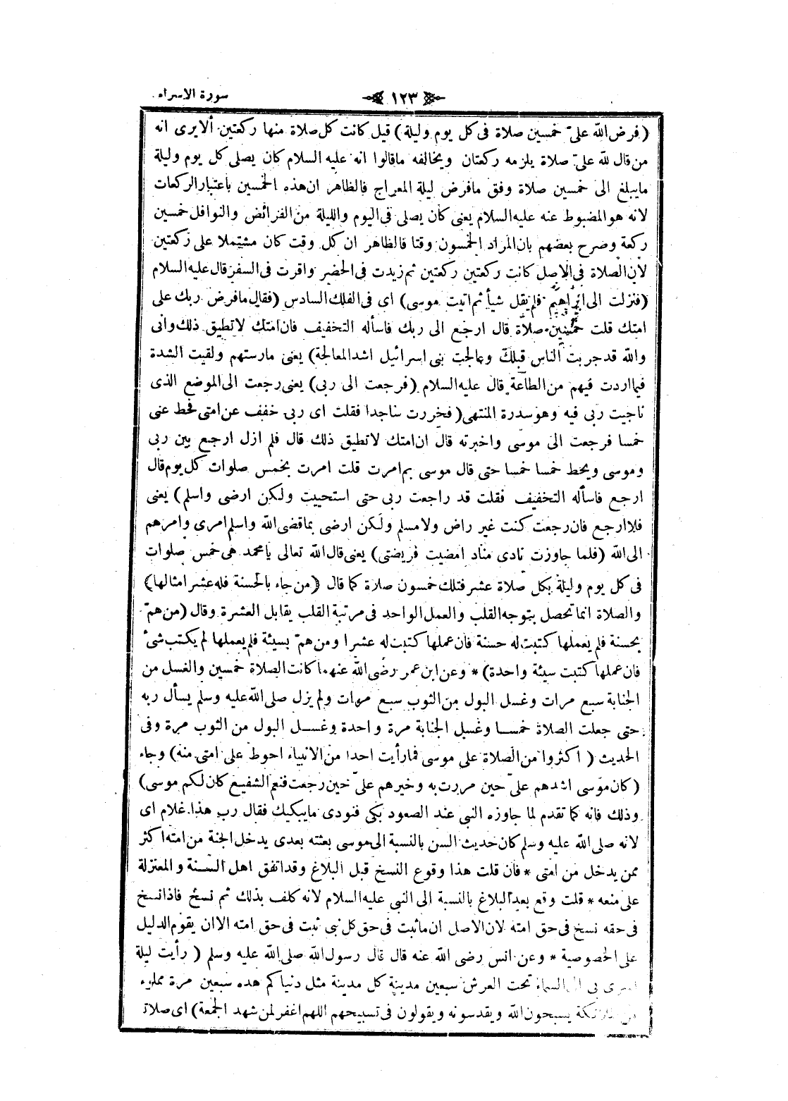 (فرض الله علىّ خمسين صلاة فى كل يوم وليلة) قيل كانت كل صلاة منها ركعتين ألا يرى انه من قال لله على صلاة يلزمه ركعتان ويخالفه ما قالوا انه عليه السلام كان يصلى كل يوم وليلة ما يبلغ الى خمسين صلاة وفق ما فرض ليلة المعراج فالظاهر ان هذه الخمسين باعتبار الركعات لانه هو المضبوط عنه عليه السلام يعنى كان يصلى فى اليوم والليلة من الفرائض والنوافل خمسين ركعة وصرح بعضهم بان المراد الخمسون وقتا فالظاهر ان كل وقت كان مشتملا على ركعتين لان الصلاة فى الأصل كانت ركعتين ركعتين ثم زيدت فى الحضر وأقرت فى السفر قال عليه السلام (فنزلت الى ابراهيم فلم يقل شيأ ثم أتيت موسى) اى فى الفلك السادس (فقال ما فرض ربك على أمتك قلت خمسين صلاة قال ارجع الى ربك فاسأله التخفيف فان أمتك لا تطيق ذلك وانى والله قد جربت الناس قبلك وعالجت بنى إسرائيل أشد المعالجة) يعنى مارستهم ولقيت الشدة فيما أردت فيهم من الطاعة قال عليه السلام (فرجعت الى ربى) يعنى رجعت الى الموضع الذي ناجيت ربى فيه وهو سدرة المنتهى (فخررت ساجدا فقلت اى ربى خفف عن أمتي فحط عنى خمسا فرجعت الى موسى وأخبرته قال ان أمتك لا تطيق ذلك قال فلم ازل ارجع بين ربى وموسى ويحط خمسا خمسا حتى قال موسى بم أمرت قلت أمرت بخمس صلوات كل يوم قال ارجع فاسأله التخفيف فقلت قد راجعت ربى حتى استحييت ولكن ارضى واسلم) يعنى فلا ارجع فان رجعت كنت غير راض ولا مسلم ولكن ارضى بما قضى الله واسلم امرى وأمرهم الى الله (فلما جاوزت نادى مناد أمضيت فريضتى) يعنى قال الله تعالى يا محمد هى خمس صلوات فى كل يوم وليلة بكل صلاة عشر فتلك خمسون صلاة كما قال مَنْ جاءَ بِالْحَسَنَةِ فَلَهُ عَشْرُ أَمْثالِها والصلاة انما تحصل بتوجه القلب والعمل الواحد فى مرتبة القلب يقابل العشرة وقال (من همّ بحسنة فلم يعملها كتبت له حسنة فان عملها كتبت له عشرا ومن همّ بسيئة فلم يعملها لم يكتب شىء فان عملها كتبت سيئة واحدة) وعن ابن عمر رضى الله عنهما