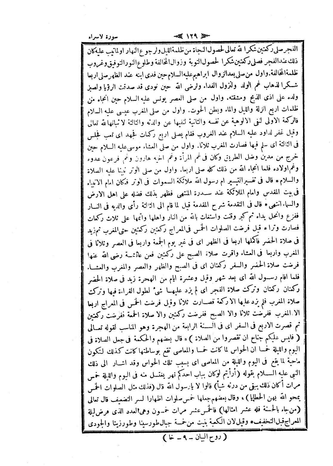 وامام الملائكة عند سدرة المنتهى فظهر بذلك فضله على اهل الأرض والسماء انتهى قال فى التقدمة شرح المقدمة قيل لما قام الى الثالثة رأى والديه فى النار ففزع وانحل يداه ثم كبر وقنت واستغاث بالله من النار وأهلها وأتمها على ثلاث ركعات فصارت وترا قيل فرضت الصلوات الخمس فى المعراج ركعتين ركعتين حتى المغرب ثم زيد فى صلاة الحضر فاكملها أربعا فى الظهر اى فى غير يوم الجمعة وأربعا فى العصر وثلاثا فى المغرب وأربعا فى العشاء وأقرت صلاة الصبح على ركعتين فعن عائشة رضى الله عنها فرضت صلاة الحضر والسفر ركعتان اى فى الصبح والظهر والعصر والمغرب والعشاء فلما اقام رسول الله اى بعد شهر وقيل وعشرة ايام من الهجرة زيد فى صلاة الحضر ركعتان ركعتان وتركت صلاة الفجر اى لم يزد عليها شىء لطول القراءة فيها وتركت صلاة المغرب فلم يزد عليها الا ركعة فصارت ثلاثا وقيل فرضت الخمس فى المعراج أربعا الا المغرب ففرضت ثلاثا والا الصبح ففرضت ركعتين ولا صلاة الجمعة ففرضت ركعتين ثم قصرت الأربع فى السفر اى فى السنة الرابعة من الهجرة وهو المناسب لقوله تعالى فَلَيْسَ عَلَيْكُمْ جُناحٌ أَنْ تَقْصُرُوا مِنَ الصَّلاةِ قال بعضهم والحكمة فى جعل الصلاة فى اليوم والليلة خمسا ان الحواس لما كانت خمسا والمعاصي تقع بوساطتها كانت كذلك لتكون ماحية لما يقع فى اليوم والليلة من المعاصي اى بسبب تلك الحواس وقد أشار الى ذلك النبي عليه السلام بقوله (أرأيتم لو كان بباب أحدكم نهر يغتسل منه فى اليوم والليلة خمس مرات أكان ذلك يبقى من درنه شيأ) قالوا لا يا رسول الله قال (فذلك مثل الصلوات الخمس يمحو الله بهن الخطايا) وقال بعضهم جعلها خمس صلوات إظهارا لسر التضعيف قال تعالى مَنْ جاءَ بِالْحَسَنَةِ فَلَهُ عَشْرُ أَمْثالِها فالخمس عشر مرات خمسون وهى العدد الذي فرض ليلة المعراج قبل التخفيف وقيل لان الكعبة بنيت من خمسة جبال طور سينا وطور زيتا والجودي