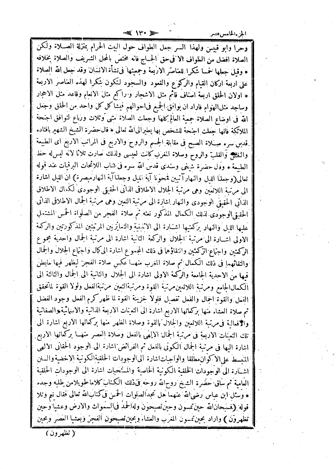 مرتبة اللاتعين والجلال بالقوة وصلاة الظهر منها بركعاتها الأربع اشارة الى تلك التعينات الاربعة فى مرتبة الجمال الإلهي بالفعل وصلاة العصر منها بركعاتها الأربع اشارة إليها فى مرتبة الجمال الكونى بالفعل ثم الفرائض اشارة الى الوجود الحقانى الإلهي المنبسط على الأكوان مطلقا والواجبات اشارة الى الوجودات الخلقية الكونية الاخصية والسنن اشارة الى الوجودات الخلقية الكونية الخاصية والمستحبات اشارة الى الوجودات الخلقية العامية ثم ساق حضرة الشيخ روح الله روحه فى ذلك الكتاب كلاما طويلا من طلبه وجده وسئل ابن عباس رضى الله عنهما هل تجد الصلوات الخمس فى كتاب الله تعالى فقال نعم وتلا قوله فَسُبْحانَ اللَّهِ حِينَ تُمْسُونَ وَحِينَ تُصْبِحُونَ وَلَهُ الْحَمْدُ فِي السَّماواتِ وَالْأَرْضِ وَعَشِيًّا وَحِينَ تُظْهِرُونَ وأراد بحين تمسون المغرب والعشاء وبحين تصبحون الفجر وبعشيا العصر وبحين