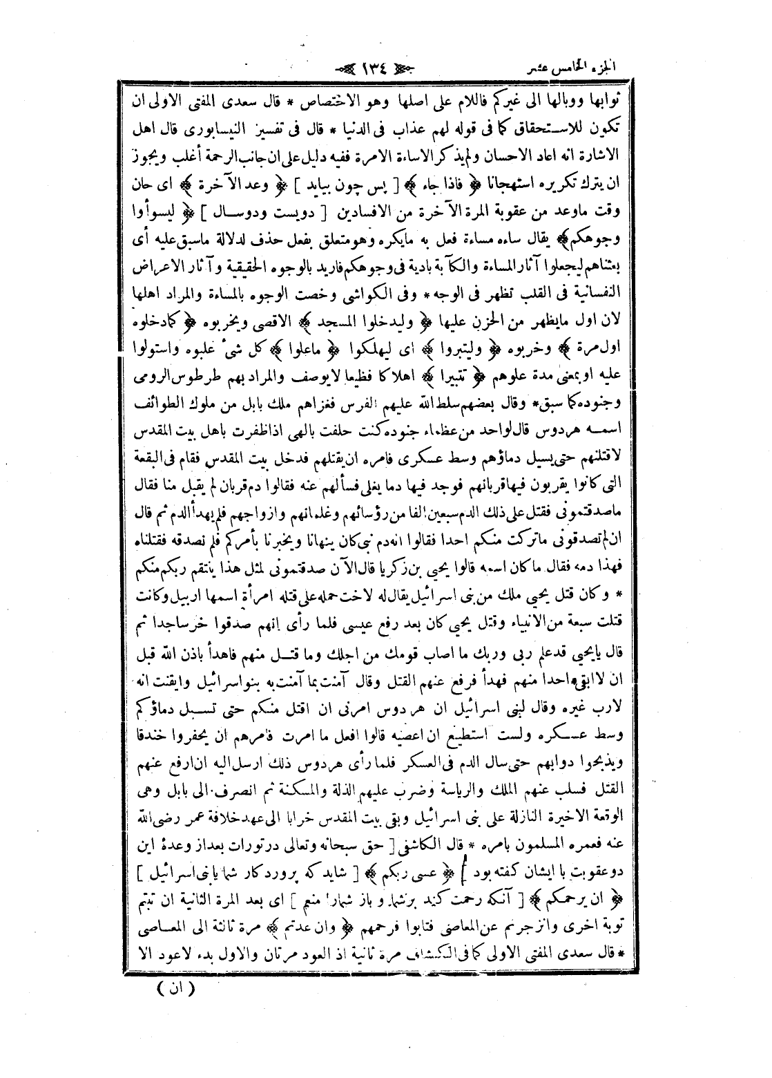 ثوابها ووبالها الى غيركم فاللام على أصلها وهو الاختصاص قال سعدى المفتى الاولى ان تكون للاستحقاق كما فى قوله لهم عذاب فى الدنيا قال فى تفسير النيسابورى قال اهل الاشارة انه أعاد الإحسان ولم يذكر الاساءة إلا مرة ففيه دليل على ان جانب الرحمة أغلب ويجوز ان يترك تكريره استهجانا فَإِذا جاءَ [پس چون بيايد] وَعْدُ الْآخِرَةِ اى حان وقت ما وعد من عقوبة المرة الآخرة من الافسادين [دويست ودو سال] لِيَسُوؤُا وُجُوهَكُمْ يقال ساءه مساءة فعل به ما يكره وهو متعلق بفعل حذف لدلالة ما سبق عليه أي بعثناهم ليجعلوا آثار المساءة والكآبة بادية فى وجوهكم فاريد بالوجوه الحقيقية وآثار الاعراض النفسانية فى القلب تظهر فى الوجه وفى الكواشي وخصت الوجوه بالمساءة والمراد أهلها لان أول ما يظهر من الحزن عليها وَلِيَدْخُلُوا الْمَسْجِدَ الأقصى ويخربوه كَما دَخَلُوهُ أَوَّلَ مَرَّةٍ وخربوه وَلِيُتَبِّرُوا اى ليهلكوا ما عَلَوْا كل شىء علبوه واستولوا عليه او بمعنى مدة علوهم تَتْبِيراً إهلاكا فظيعا لا يوصف والمراد بهم طرطوس الرومي وجنوده كما سبق وقال بعضهم سلط الله عليهم الفرس فغزاهم ملك بابل من ملوك الطوائف اسمه هردوس قال لواحد من عظماء جنوده كنت حلفت بإلهي إذا ظفرت باهل بيت المقدس لاقتلنهم حتى يسيل دماؤهم وسط عسكرى فامره ان يقتلهم فدخل بيت المقدس فقام فى البقعة التي كانوا يقربون فيها قربانهم فوجد فيها دما يغلى فسألهم عنه فقالوا دم قربان لم يقبل منا فقال ما صدقتمونى فقتل على ذلك الدم سبعين الفا من رؤسائهم وغلمانهم وأزواجهم فلم يهدأ الدم ثم قال ان لم تصدقونى ما تركت منكم أحدا فقالوا انه دم نبى كان ينهانا ويخبرنا بأمركم فلم تصدقه فقتلناه فهذا دمه فقال ما كان اسمه قالوا يحيى بن زكريا قال الآن صدقتمونى لمثل هذا ينتقم ربكم منكم وكان قتل يحيى ملك من بنى إسرائيل يقال له لا خت حمله على قتله امرأة اسمها اربيل وكانت قتلت سبعة من الأنبياء وقتل يحيى كان بعد رفع عيسى فلما رأى انهم صدقوا خر ساجدا ثم قال يا يحيى قد علم ربى وربك ما أصاب قومك من أجلك وما قتل منهم فاهدأ بإذن الله قبل ان لا أبقى أحدا منهم فهدأ فرفع عنهم القتل وقال آمنت بما آمنت به بنو إسرائيل وأيقنت انه لا رب غيره وقال لبنى إسرائيل ان هر دوس أمرني ان اقتل منكم حتى تسيل دماؤكم وسط عسكره ولست أستطيع ان أعصيه قالوا افعل ما أمرت فامرهم ان يحفروا خندقا ويذبحوا دوابهم حتى سال الدم فى العسكر فلما رأى هر دوس ذلك أرسل اليه ان ارفع عنهم القتل فسلب عنهم الملك والرياسة وضرب عليهم الذلة والمسكنة ثم انصرف الى بابل وهى الواقعة الاخيرة النازلة على بنى إسرائيل وبقي بيت المقدس خرابا الى عهد خلافة عمر رضى الله عنه فعمره المسلمون بامره قال الكاشفى [حق سبحانه وتعالى در تورات بعد از وعده اين دو عقوبت با ايشان گفته بود] عَسى رَبُّكُمْ [شايد كه پروردگار شما يا بنى إسرائيل] أَنْ يَرْحَمَكُمْ [آنكه رحمت كند بر شما وباز شما را منعم] اى بعد المرة الثانية ان تبتم توبة اخرى وانزجرتم عن المعاصي فتابوا فرحمهم وَإِنْ عُدْتُمْ مرة ثالثة الى المعاصي قال سعدى المفتى الاولى كما فى الكشاف مرة ثانية إذ العود مرتان والاول بدء لا عود الا