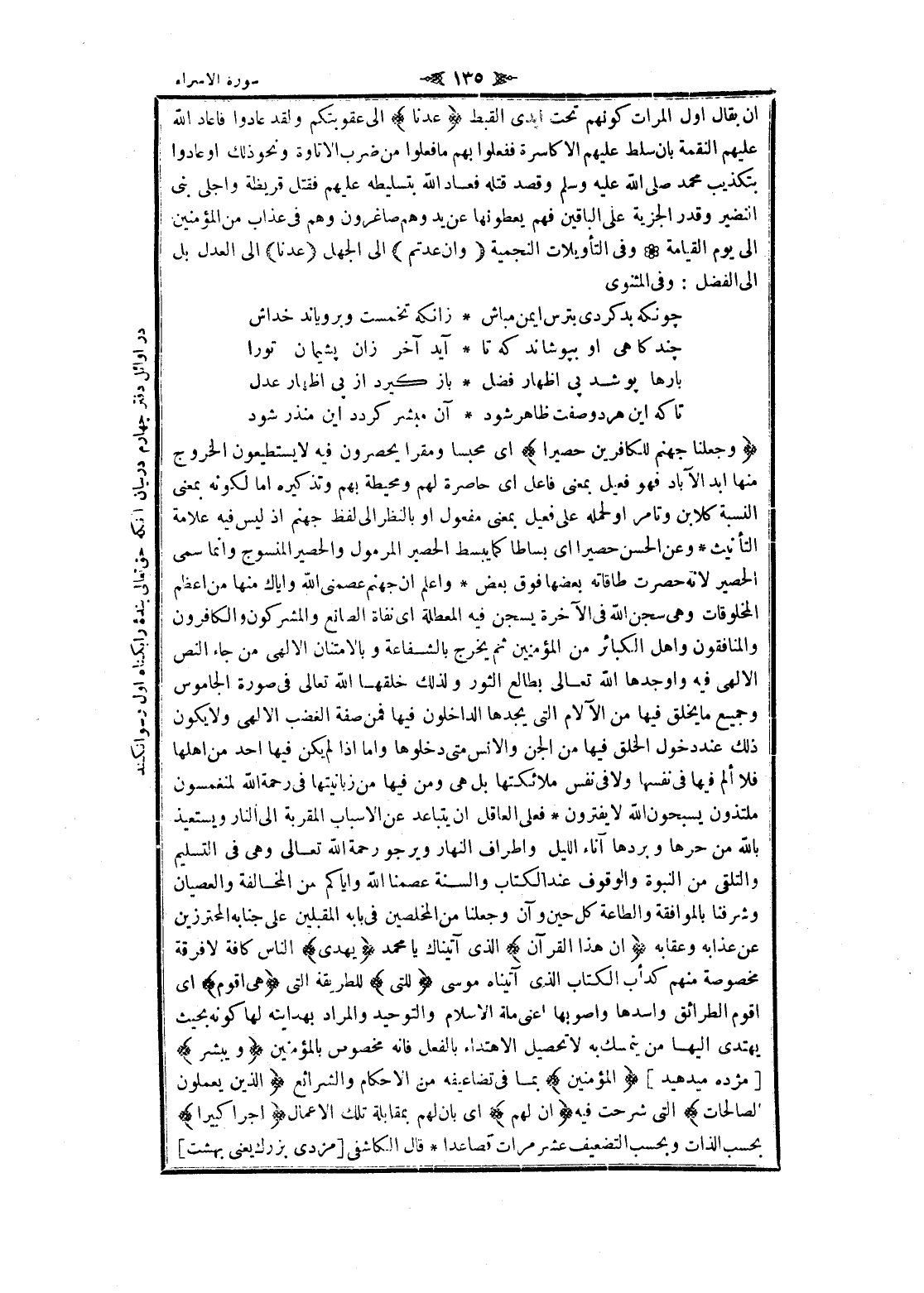 وَجَعَلْنا جَهَنَّمَ لِلْكافِرِينَ حَصِيراً اى محبسا ومقرا يحصرون فيه لا يستطيعون الخروج منها ابد الآباد فهو فعيل بمعنى فاعل اى حاصرة لهم ومحيطة بهم وتذكيره اما لكونه بمعنى النسبة كلابن وتامر او لحمله على فعيل بمعنى مفعول او بالنظر الى لفظ جهنم إذ ليس فيه علامة التأنيث وعن الحسن حصيرا اى بساطا كما يبسط الحصير المرمول والحصير المنسوج وانما سمى الحصير لانه حصرت طاقاته بعضها فوق بعض واعلم ان جهنم عصمنى الله وإياك منها من أعظم المخلوقات وهى سجن الله فى الآخرة يسجن فيه المعطلة اى نفاة الصانع والمشركون والكافرون والمنافقون واهل الكبائر من المؤمنين ثم يخرج بالشفاعة وبالامتنان الإلهي من جاء النص الإلهي فيه وأوجدها الله تعالى بطالع الثور ولذلك خلقها الله تعالى فى صورة الجاموس وجميع ما يخلق فيها من الآلام التي يجدها الداخلون فيها فمن صفة الغضب الإلهي ولا يكون ذلك عند دخول الخلق فيها من الجن والانس متى دخولها واما إذا لم يكن فيها أحد من أهلها فلا ألم فيها فى نفسها ولا فى نفس ملائكتها بل هى ومن فيها من زبانيتها فى رحمة الله لمنغمسون ملتذون يسبحون الله لا يفترون فعلى العاقل ان يتباعد عن الأسباب المقربة الى النار ويستعيذ بالله من حرها وبردها آناء الليل وأطراف النهار ويرجو رحمة الله تعالى وهى فى التسليم والتلقي من النبوة والوقوف عند الكتاب والسنة عصمنا الله وإياكم من المخالفة والعصيان وشرفنا بالموافقة والطاعة كل حين وآن وجعلنا من المخلصين فى بابه المقبلين على جنابه المحترزين عن عذابه وعقابه إِنَّ هذَا الْقُرْآنَ الذي آتيناك يا محمد يَهْدِي الناس كافة لا فرقة مخصوصة منهم كدأب الكتاب الذي آتيناه موسى لِلَّتِي للطريقة التي هِيَ أَقْوَمُ اى أقوم الطرائق وأسدها وأصوبها اعنى ملة الإسلام والتوحيد والمراد بهدايته لها كونه بحيث يهتدى إليها من يتمسك به لا تحصيل الاهتداء بالفعل فانه مخصوص بالمؤمنين وَيُبَشِّرُ [مژده ميدهيد] الْمُؤْمِنِينَ بما فى تضاعيفه من الاحكام والشرائع الَّذِينَ يَعْمَلُونَ الصَّالِحاتِ التي شرحت فيه أَنَّ لَهُمْ اى بان لهم بمقابلة تلك الأعمال أَجْراً كَبِيراً بحسب الذات وبحسب التضعيف عشر مرات فصاعدا قال الكاشفى [مزدى بزرگ يعنى بهشت]