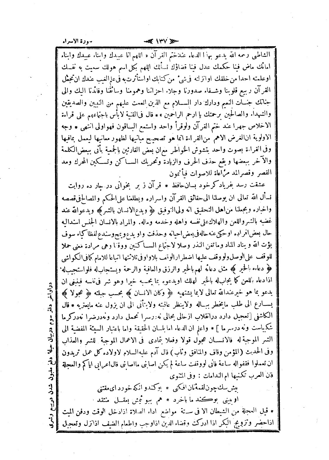 الشاطبي رحمه الله يدعو بهذا الدعاء عند ختم القرآن «اللهم انا عبيدك وأبناء عبيدك وأبناء إمائك ماض فينا حكمك عدل فينا قضاؤك نسألك اللهم بكل اسم هو لك سميت به نفسك او علمته أحدا من خلقك او أنزلته فى شىء من كتابك او استأثرت به فى علم الغيب عندك ان تجعل القرآن ربيع قلوبنا وشفاء صدورنا وجلاء احزاننا وهمومنا وسائقنا وقائدنا إليك والى جناتك جنات النعيم ودارك دار السلام مع الذين أنعمت عليهم من النبيين والصديقين والشهداء والصالحين برحمتك يا ارحم الراحمين» قال فى القنية لا بأس باجتماعهم على قراءة الإخلاص جهرا عند ختم القرآن ولو قرأ واحد واستمع الباقون فهو اولى انتهى وجه الاولوية ان الغرض الأهم من القراءة انما هو تصحيح مبانيها لظهور معانيها ليعمل بما فيها وفى القراءة بصوت واحد يتشوش الخواطر مع ان بعض القارئين بالجمعية يأتى ببعض الكلمة والآخر ببعضها ويقع حذف الحرف والزيادة وتحريك الساكن وتسكين المحرك ومد القصر وقصر المد مراعاة للاصوات فيأثمون