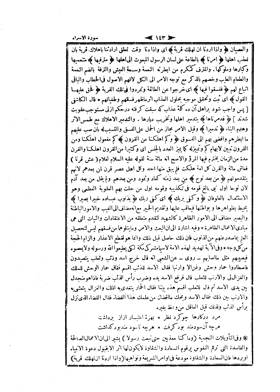 وفى التأويلات النجمية وَما كُنَّا مُعَذِّبِينَ حَتَّى نَبْعَثَ رَسُولًا بشير الى ان الأعمال الصالحة والفاسدة التي ترقم النفوس يرقوم السعادة والشقاوة لا يكون لها اثر الا بقبول دعوة الأنبياء او يردها فان السعادة والشقاوة مودعة فى أوامر الشريعة ونواهيها وَإِذا أَرَدْنا أَنْ نُهْلِكَ قَرْيَةً