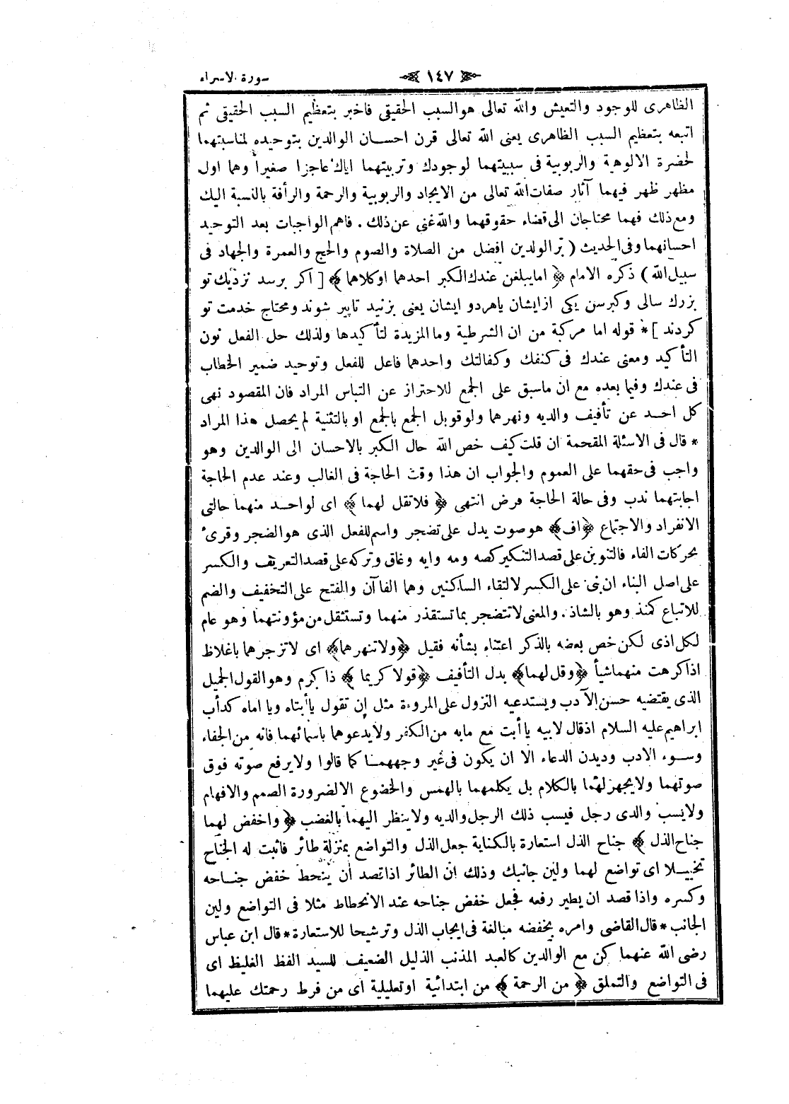 الظاهري للوجود والتعيش والله تعالى هو السبب الحقيقي فاخبر بتعظيم السبب الحقيقي ثم اتبعه بتعظيم السبب الظاهري يعنى الله تعالى قرن احسان الوالدين بتوحيده لمناسبتهما لحضرة الالوهية والربوبية فى سببيتهما لوجودك وتربيتهما إياك عاجزا صغيرا وهما أول مظهر ظهر فيهما آثار صفات الله تعالى من الإيجاد والربوبية والرحمة والرأفة بالنسبة إليك ومع ذلك فهما محتاجان الى قضاء حقوقهما والله غنى عن ذلك. فاهم الواجبات بعد التوحيد إحسانهما وفى الحديث (بر الوالدين أفضل من الصلاة والصوم والحج والعمرة والجهاد فى سبيل الله) ذكره الامام إِمَّا يَبْلُغَنَّ عِنْدَكَ الْكِبَرَ أَحَدُهُما أَوْ كِلاهُما [اگر برسد نزديك تو بزرگ سالى وكبر سن يكى از ايشان يا هر دو ايشان يعنى بزنيد تا پير شوند ومحتاج خدمت تو كردند] قوله اما مركبة من ان الشرطية وما المزيدة لتأكيدها ولذلك حل الفعل نون التأكيد ومعنى عندك فى كنفك وكفالتك وأحدهما فاعل للفعل وتوحيد ضمير الخطاب فى عندك وفيما بعده مع ان ما سبق على الجمع للاحتراز عن التباس المراد فان المقصود نهى كل أحد عن تأفيف والديه ونهرهما ولو قوبل الجمع بالجمع او بالتثنية لم يحصل هذا المراد قال فى الاسئلة المقحمة ان قلت كيف خص الله حال الكبر بالإحسان الى الوالدين وهو واجب فى حقهما على العموم والجواب ان هذا وقت الحاجة فى الغالب وعند عدم الحاجة اجابتهما ندب وفى حالة الحاجة فرض انتهى فَلا تَقُلْ لَهُما اى لواحد منهما حالتى الانفراد والاجتماع أُفٍّ هو صوت يدل على تضجر واسم للفعل الذي هو الضجر وقرئ بحركات الفاء فالتنوين على قصد التنكير كصه ومه وايه وغاق وتركه على قصد التعريف والكسر على اصل البناء ان بنى على الكسر لالتقاء الساكنين وهما الفا آن والفتح على التخفيف والضم للاتباع كمنذ وهو بالشاذ. والمعنى لا تتضجر بما تستقذر منهما وتستثقل من مؤونتهما وهو عام لكل أذى لكن خص بعضه بالذكر اعتناء بشأنه فقيل وَلا تَنْهَرْهُما اى لا تزجرهما بإغلاظ إذا كرهت منهما شيأ وَقُلْ لَهُما بدل التأليف قَوْلًا كَرِيماً ذا كرم وهو القول الجميل الذي يقتضيه حسن الآدب ويستدعيه النزول على المروءة مثل ان تقول يا أبتاه ويا أماه كدأب ابراهيم عليه السلام إذ قال لابيه يا أبت مع مابه من الكفر ولا يدعوهما باسمائهما فانه من الجفاء وسوء الأدب وديدن الدعاء الا ان يكون فى غير وجههما كما قالوا ولا يرفع صوته فوق صوتهما ولا يجهر لهما بالكلام بل يكلمهما بالهمس والخضوع الا لضرورة الصمم والافهام ولا يسب والدي رجل فيسب ذلك الرجل والديه ولا ينظر إليهما بالغضب وَاخْفِضْ لَهُما جَناحَ الذُّلِّ جناح الذل استعارة بالكناية جعل الذل والتواضع بمنزلة طائر فاثبت له الجناح تخبيلا اى تواضع لهما ولين جانبك وذلك ان الطائر إذا قصد ان ينحط خفض جناحه وكسره وإذا قصد ان يطير رفعه فجعل خفض جناحه عند الانحطاط مثلا فى التواضع ولين الجانب قال القاضي وامره بخفضه مبالغة فى إيجاب الذل وترشيحا للاستعارة قال ابن عباس رضى الله عنهما كن مع الوالدين كالعبد المذنب الذليل الضعيف للسيد الفظ الغليظ اى فى التواضع والتملق مِنَ الرَّحْمَةِ من ابتدائية او تعليلية اى من فرط رحمتك عليهما