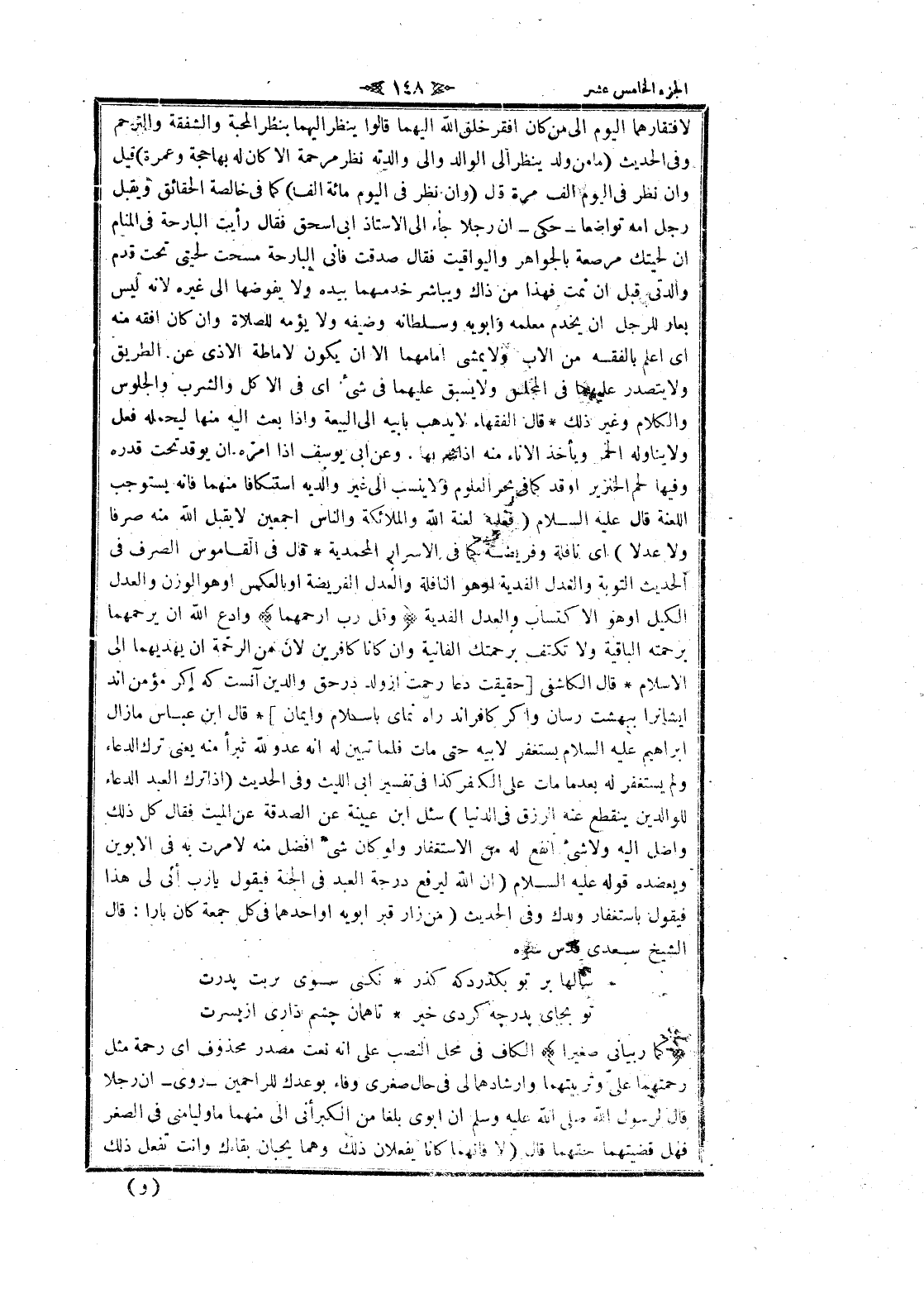 والشرب والجلوس والكلام وغير ذلك قال الفقهاء لا يذهب بابيه الى البيعة وإذا بعث اليه منها ليحمله فعل ولا يناوله الخمر ويأخذ الإناء منه إذا شربها. وعن ابى يوسف إذا امره ان يوقد تحت قدره وفيها لحم الخنزير أوقد كما فى بحر العلوم ولا ينسب الى غير والديه استنكافا منهما فانه يستوجب اللعنة قال عليه السلام (فعليه لعنة الله والملائكة والناس أجمعين لا يقبل الله منه صرفا ولا عدلا) اى نافلة وفريضة كما فى الاسرار المحمدية قال فى القاموس الصرف فى الحديث التوبة والعدل الفدية او هو النافلة والعدل الفريضة او بالعكس او هو الوزن والعدل الكيل او هو الاكتساب والعدل الفدية وَقُلْ رَبِّ ارْحَمْهُما وادع الله ان يرحمهما برحمته الباقية ولا تكتف برحمتك الفانية وان كانا كافرين لان من الرحمة ان يهديهما الى الإسلام قال الكاشفى [حقيقت دعا رحمت از ولد در حق والدين آنست كه اگر مؤمن اند ايشانرا ببهشت رسان واگر كافراند راه نماى بإسلام وايمان] قال ابن عباس مازال ابراهيم عليه السلام يستغفر لابيه حتى مات فلما تبين له انه عدو لله تبرأ منه يعنى ترك الدعاء ولم يستغفر له بعد ما مات على الكفر كذا فى تفسير ابى الليث وفى الحديث (إذا ترك العبد الدعاء للوالدين ينقطع عنه الرزق فى الدنيا) سئل ابن عيينة عن الصدقة عن الميت فقال كل ذلك واصل اليه ولا شىء انفع له من الاستغفار ولو كان شىء أفضل منه لا مرت به فى الأبوين ويعضده قوله عليه السلام (ان الله ليرفع درجة العبد فى الجنة فيقول يا رب أنى لى هذا فيقول باستغفار ولدك وفى الحديث (من زار قبر أبويه او أحدهما فى كل جمعة كان بارا: قال الشيخ سعدى قدس سره