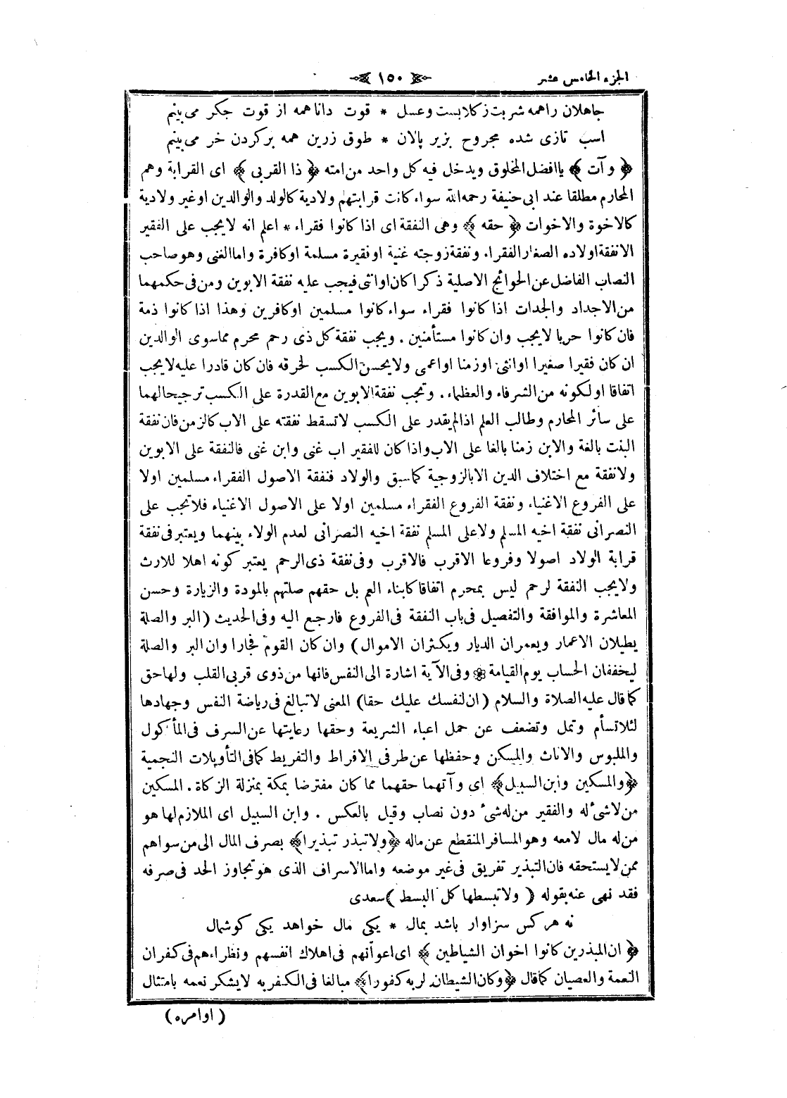 وَآتِ يا أفضل المخلوق ويدخل فيه كل واحد من أمته ذَا الْقُرْبى اى القرابة وهم المحارم مطلقا عند ابى حنيفة رحمه الله سواء كانت قرابتهم ولا دية كالولد والوالدين او غير ولا دية كالاخوة والأخوات حَقَّهُ وهى النفقة اى إذا كانوا فقراء اعلم انه لا يجب على الفقير إلا نفقة أولاده الصغار الفقراء ونفقة زوجته غنية او فقيرة مسلمة او كافرة واما الغنى وهو صاحب النصاب الفاضل عن الحوائج الاصلية ذكرا كان او أنثى فيجب عليه نفقة الأبوين ومن فى حكمهما من الأجداد والجدات إذا كانوا فقراء سواء كانوا مسلمين او كافرين وهذا إذا كانوا ذمة فان كانوا حربا لا يجب وان كانوا مستأمنين. ويجب نفقة كل ذى رحم محرم مما سوى الوالدين ان كان فقيرا صغيرا او أنثى او زمنا او أعمى ولا يحسن الكسب لخرقه فان كان قادرا عليه لا يجب اتفاقا او لكونه من الشرفاء والعظماء. وتجب نفقة الأبوين مع القدرة على الكسب ترجيحا لهما على سائر المحارم وطالب العلم إذا لم يقدر على الكسب لا تسقط نفقته على الأب كالزمن فان نفقة البنت بالغة والابن زمنا بالغا على الأب وإذا كان للفقير اب غنى وابن غنى فالنفقة على الأبوين ولا نفقة مع اختلاف الدين الا بالزوجية كما سبق والولاد فنفقة الأصول الفقراء مسلمين اولا على الفروع الأغنياء ونفقة الفروع الفقراء مسلمين اولا على الأصول الأغنياء فلا تجب على النصراني نفقة أخيه المسلم ولا على المسلم نفقة أخيه النصراني لعدم الولاء بينهما ويعتبر فى نفقة قرابة الولاد اصولا وفروعا الأقرب فالاقرب وفى نفقة ذى الرحم يعتبر كونه أهلا للارث ولا يجب النفقة لرحم ليس بمحرم اتفاقا كابناء العم بل حقهم صلتهم بالمودة والزيارة وحسن المعاشرة والموافقة والتفصيل فى باب النفقة فى الفروع فارجع اليه وفى الحديث (البر والصلة يطيلان الأعمار ويعمران الديار ويكثران الأموال) وان كان القوم فجارا وان البر والصلة ليخففان الحساب يوم القيامة وفى الآية اشارة الى النفس فانها من ذوى قربى القلب ولها حق كما قال عليه الصلاة والسلام (ان لنفسك عليك حقا) المعنى لا تبالغ فى رياضة النفس وجهادها لئلا تسأم وتمل وتضعف عن حمل أعباء الشريعة وحقها رعايتها عن السرف فى المأكول والملبوس والإناث والمسكن وحفظها عن طرفى الافراط والتفريط كما فى التأويلات النجمية وَالْمِسْكِينَ وَابْنَ السَّبِيلِ اى وآتهما حقهما مما كان مفترضا بمكة بمنزلة الزكاة. المسكين من لا شىء له والفقير من له شىء دون نصاب وقيل بالعكس. وابن السبيل اى الملازم لها هو من له مال لا معه وهو المسافر المنقطع عن ماله وَلا تُبَذِّرْ تَبْذِيراً بصرف المال الى من سواهم ممن لا يستحقه فان التبذير تفريق فى غير موضعه واما الإسراف الذي هو تجاوز الحد فى صرفه فقد نهى عنه بقوله وَلا تَبْسُطْها كُلَّ الْبَسْطِ سعدى