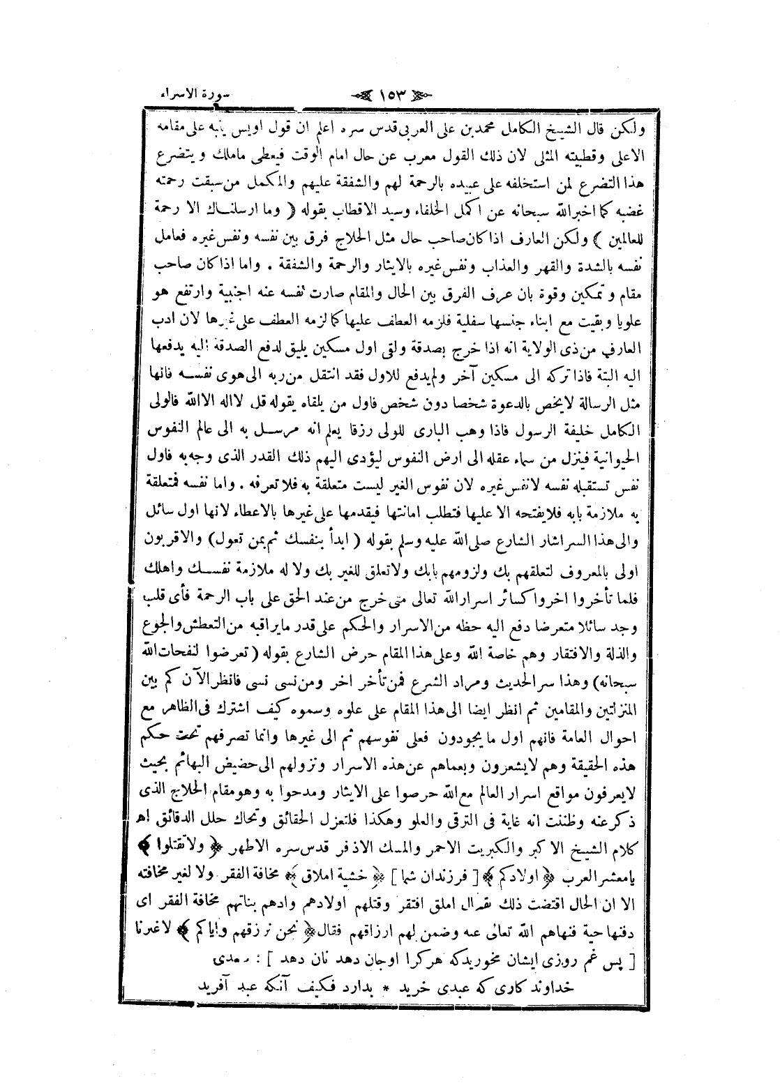 ولكن قال الشيخ الكامل محمد بن على العربي قدس سره اعلم ان قول اويس ينبه على مقامه الأعلى وقطيته المثلى لان ذلك القول معرب عن حال امام الوقت فيعطى ما ملك ويتضرع هذا التضرع لمن استخلفه على عبيده بالرحمة لهم والشفقة عليهم والمكمل من سبقت رحمته غضبه كما اخبر الله سبحانه عن أكمل الخلفاء وسيد الاقطاب بقوله وَما أَرْسَلْناكَ إِلَّا رَحْمَةً لِلْعالَمِينَ ولكن العارف إذا كان صاحب حال مثل الحلاج فرق بين نفسه ونفس غيره فعامل نفسه بالشدة والقهر والعذاب ونفس غيره بالإيثار والرحمة والشفقة. واما إذا كان صاحب مقام وتمكين وقوة بان عرف الفرق بين الحال والمقام صارت نفسه عنه اجنبية وارتفع هو علويا وبقيت مع أبناء جنسها سفلية فلزمه العطف عليها كما لزمه العطف على غيرها لان ادب العارف من ذى الولاية انه إذا خرج بصدقة ولقى أول مسكين يليق لدفع الصدقة اليه يدفعها اليه البتة فاذا تركه الى مسكين آخر ولم يدفع للاول فقد انتقل من ربه الى هوى نفسه فانها مثل الرسالة لا يخص بالدعوة شخصا دون شخص فاول من يلقاه يقوله قل لا اله الا الله فالولى الكامل خليفة الرسول فاذا وهب الباري للولى رزقا يعلم انه مرسل به الى عالم النفوس الحيوانية فينزل من سماء عقله الى ارض النفوس ليؤدى إليهم ذلك القدر الذي وجه به فاول نفس تستقبله نفسه لا نفس غيره لان نفوس الغير ليست متعلقة به فلا تعرفه. واما نفسه فمتعلقة به ملازمة بابه فلا يفتحه الا عليها فتطلب امانتها فيقدمها على غيرها بالإعطاء لانها أول سائل والى هذا السر أشار الشارع صلى الله عليه وسلم بقوله (ابدأ بنفسك ثم بمن تعول) والأقربون اولى بالمعروف لتعلقهم بك ولزومهم بابك ولا تعلق للغير بك ولا له ملازمة نفسك وأهلك فلما تأخروا أخروا كسائر اسرار الله تعالى متى خرج من عند الحق على باب الرحمة فأى قلب وجد سائلا متعرضا دفع اليه حظه من الاسرار والحكم على قدر ما يراقبه من التعطش والجوع والذلة والافتقار وهم خاصة الله وعلى هذا المقام حرض الشارع بقوله (تعرضوا لنفحات الله سبحانه) وهذا سر الحديث ومراد الشرع فمن تأخر اخر ومن نسى نسى فانظر الآن كم بين المنزلتين والمقامين ثم انظر ايضا الى هذا المقام على علوه وسموه كيف اشترك فى الظاهر مع احوال العامة فانهم أول ما يجودون فعلى نفوسهم ثم الى غيرها وانما تصرفهم تحت حكم هذه الحقيقة وهم لا يشعرون وبعماهم عن هذه الاسرار ونزولهم الى حضيض البهائم بحيث لا يعرفون مواقع اسرار العالم مع الله حرصوا على الإيثار ومدحوا به وهو مقام الحلاج الذي ذكر عنه وظننت انه غاية فى الترقي والعلو وهكذا فلتعزل الحقائق وتحاك حلل الدقائق أهم كلام الشيخ الأكبر والكبريت الأحمر والمسك الأذفر قدس سره الأطهر وَلا تَقْتُلُوا يا معشر العرب أَوْلادَكُمْ [فرزندان شما] خَشْيَةَ إِمْلاقٍ مخافة الفقر ولا لغير مخافته الا ان الحال اقتضت ذلك يقال املق افتقر وقتلهم أولادهم وادهم بناتهم مخافة الفقر اى دفنها حية فنهاهم الله تعالى عنه وضمن لهم أرزاقهم فقال نَحْنُ نَرْزُقُهُمْ وَإِيَّاكُمْ لا غيرنا [پس غم روزى ايشان مخوريد كه هر كرا او جان دهد نان دهد] : سعدى