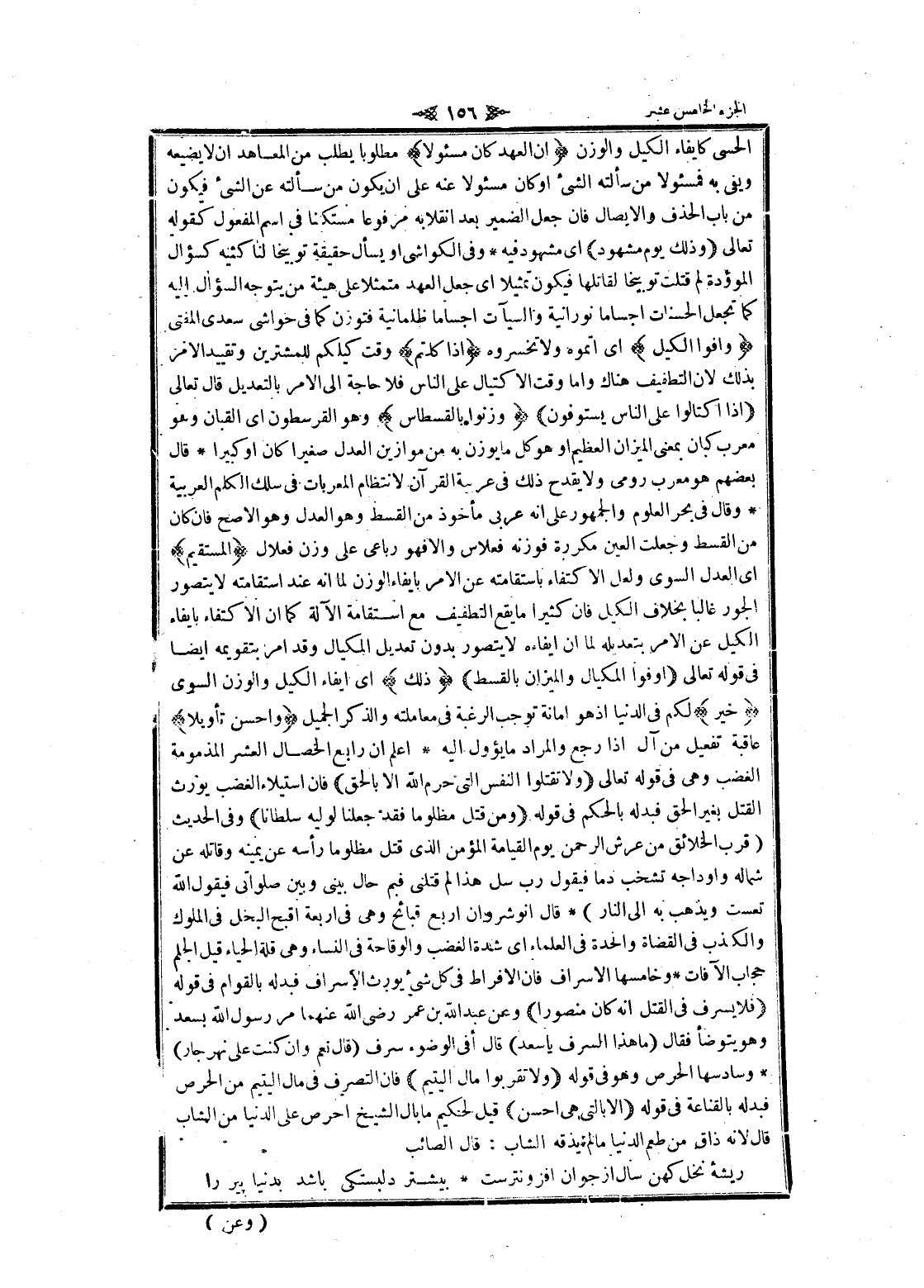الحسى كايفاء الكيل والوزن إِنَّ الْعَهْدَ كانَ مَسْؤُلًا مطلوبا يطلب من المعاهد ان لا يضيعه ويفى به فمسئولا من سألته الشيء او كان مسئولا عنه على ان يكون من سألته عن الشيء فيكون من باب الحذف والإيصال فان جعل الضمير بعد انقلابه مرفوعا مستكنا فى اسم المفعول كقوله تعالى وَذلِكَ يَوْمٌ مَشْهُودٌ اى مشهود فيه وفى الكواشي او يسأل حقيقة توبيخا لنا كثيه كسؤال الموؤدة لم قتلت توبيخا لقاتلها فيكون تمثيلا اى جعل العهد متمثلا على هيئة من يتوجه السؤال اليه كما تجعل الحسنات أجساما نورانية والسيئات أجساما ظلمانية فتوزن كما فى حواشى سعدى المفتى وَأَوْفُوا الْكَيْلَ اى اتموه ولا تخسروه إِذا كِلْتُمْ وقت كيلكم للمشترين وتقييد الأمر بذلك لان التطفيف هناك واما وقت الا كتيال على الناس فلا حاجة الى الأمر بالتعديل قال تعالى إِذَا اكْتالُوا عَلَى النَّاسِ يَسْتَوْفُونَ وَزِنُوا بِالْقِسْطاسِ وهو القرسطون اى القبان وهو معرب كبان بمعنى الميزان العظيم او هو كل ما يوزن به من موازين العدل صغيرا كان او كبيرا قال بعضهم هو معرب رومى ولا يقدح ذلك فى عربية القرآن لانتظام المعربات فى سلك الكلم العربية وقال فى بحر العلوم والجمهور على انه عربى مأخوذ من القسط وهو العدل وهو الأصح فان كان من القسط وجعلت العين مكررة فوزنه فعلاس والا فهو رباعى على وزن فعلال الْمُسْتَقِيمِ اى العدل السوي ولعل الاكتفاء باستقامته عن الأمر بايفاء الوزن لما انه عند استقامته لا يتصور الجور غالبا بخلاف الكيل فان كثيرا ما يقع التطفيف مع استقامة الآلة كما ان الاكتفاء بايفاء الكيل عن الأمر بتعديله لما ان ايفاءه لا يتصور بدون تعديل المكيال وقد امر بتقويمه ايضا فى قوله تعالى أَوْفُوا الْمِكْيالَ وَالْمِيزانَ بِالْقِسْطِ ذلِكَ اى إيفاء الكيل والوزن السوي خَيْرٌ لكم فى الدنيا إذ هو امانة توجب الرغبة فى معاملته والذكر الجميل وَأَحْسَنُ تَأْوِيلًا عاقبة تفعيل من آل إذا رجع والمراد ما يؤول اليه اعلم ان رابع الخصال العشر المذمومة الغضب وهى فى قوله تعالى وَلا تَقْتُلُوا النَّفْسَ الَّتِي حَرَّمَ اللَّهُ إِلَّا بِالْحَقِّ فان استيلاء الغضب يورث القتل بغير الحق فبدله بالحكم فى قوله وَمَنْ قُتِلَ مَظْلُوماً فَقَدْ جَعَلْنا لِوَلِيِّهِ سُلْطاناً وفى الحديث (قرب الخلائق من عرش الرحمن يوم القيامة المؤمن الذي قتل مظلوما رأسه عن يمينه وقاتله عن شماله وأوداجه تشخب دما فيقول رب سل هذا لم قتلنى فبم حال بينى وبين صلواتى فيقول الله تعست ويذهب به الى النار) قال انو شروان اربع قبائح وهى فى اربعة أقبح البخل فى الملوك والكذب فى القضاة والحدة فى العلماء اى شدة الغضب والوقاحة فى النساء وهى قلة الحياء قيل الحلم حجاب الآفات وخامسها الإسراف فان الافراط فى كل شىء يورث الإسراف فبدله بالقوام فى قوله فَلا يُسْرِفْ فِي الْقَتْلِ إِنَّهُ كانَ مَنْصُوراً وعن عبد الله بن عمر رضى الله عنهما مر رسول الله بسعد وهو يتوضأ فقال (ما هذا السرف يا سعد) قال أفي الوضوء سرف (قال نعم وان كنت على نهر جار) وسادسها الحرص وهو فى قوله وَلا تَقْرَبُوا مالَ الْيَتِيمِ فان التصرف فى مال اليتيم من الحرص فبدله بالقناعة فى قوله إِلَّا بِالَّتِي هِيَ أَحْسَنُ قيل لحكيم ما بال الشيخ احرص على الدنيا من الشاب قال لانه ذاق من طعم الدنيا ما لم يذقه الشاب: قال الصائب
