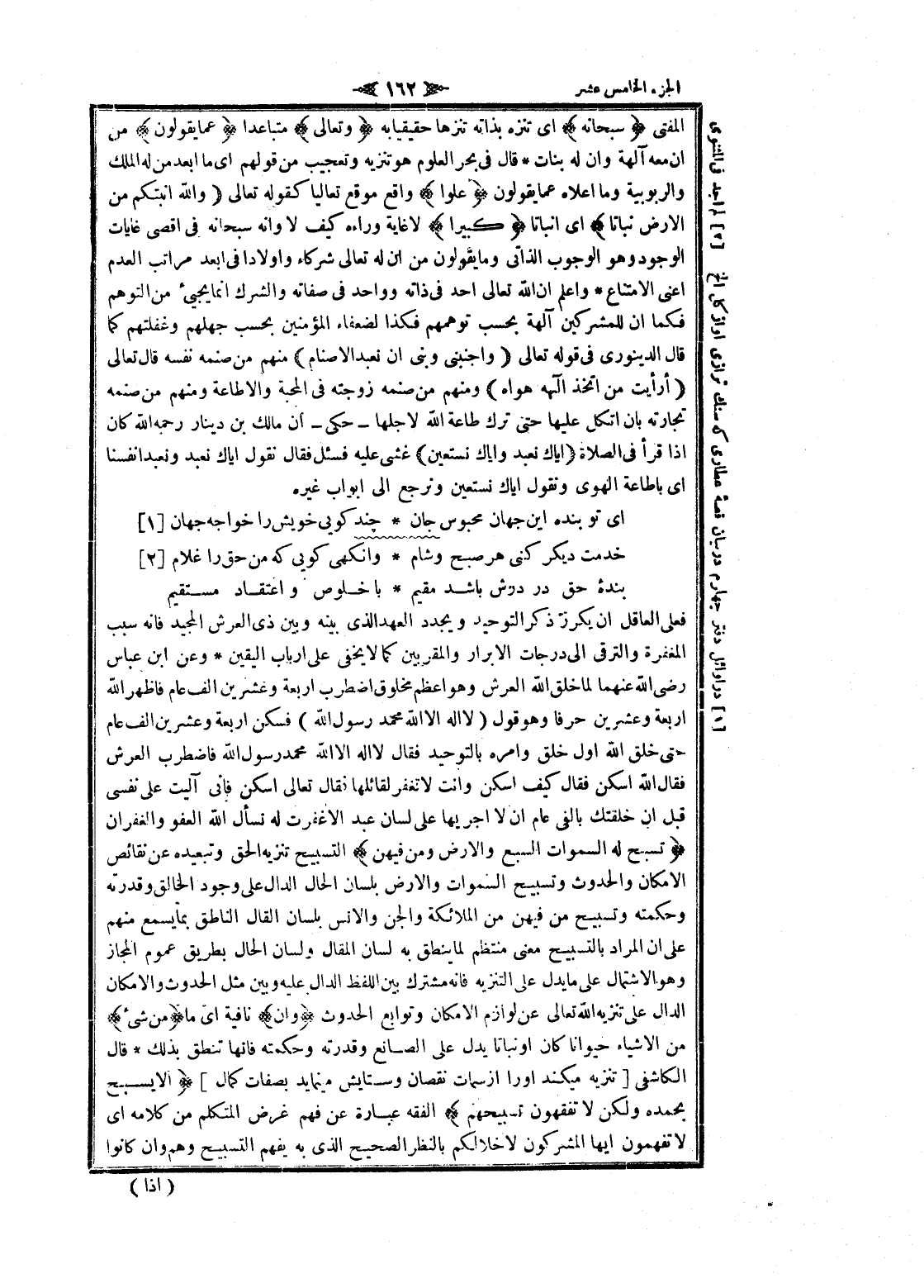 المفتى سُبْحانَهُ اى تنزه بذاته تنزها حقيقيا به وَتَعالى متباعدا عَمَّا يَقُولُونَ من ان معه آلهة وان له بنات قال فى بحر العلوم هو تنزيه وتعجيب من قولهم اى ما ابعد من له الملك والربوبية وما أعلاه غما يقولون عُلُوًّا واقع موقع تعاليا كقوله تعالى وَاللَّهُ أَنْبَتَكُمْ مِنَ الْأَرْضِ نَباتاً اى إنباتا كَبِيراً لا غاية وراءه كيف لا وانه سبحانه فى أقصى غايات الوجود وهو الوجوب الذاتي وما يقولون من ان له تعالى شركاء وأولادا فى ابعد مراتب العدم اعنى الامتناع واعلم ان الله تعالى أحد فى ذاته وواحد فى صفاته والشرك انما يجيئ من التوهم فكما ان للمشركين آلهة بحسب توهمهم فكذا لضعفاء المؤمنين بحسب جهلهم وغفلتهم كما قال الدينوري فى قوله تعالى وَاجْنُبْنِي وَبَنِيَّ أَنْ نَعْبُدَ الْأَصْنامَ منهم من صنمه نفسه قال تعالى أَرَأَيْتَ مَنِ اتَّخَذَ إِلهَهُ هَواهُ ومنهم من صنمه زوجته فى المحبة والاطاعة ومنهم من صنمه تجارته بان اتكل عليها حتى ترك طاعة الله لاجلها- حكى- ان مالك بن دينار رحمه الله كان إذا قرأ فى الصلاة إِيَّاكَ نَعْبُدُ وَإِيَّاكَ نَسْتَعِينُ غشى عليه فسئل فقال نقول إياك نعبد ونعبد أنفسنا اى باطاعة الهوى ونقول إياك نستعين ونرجع الى أبواب غيره