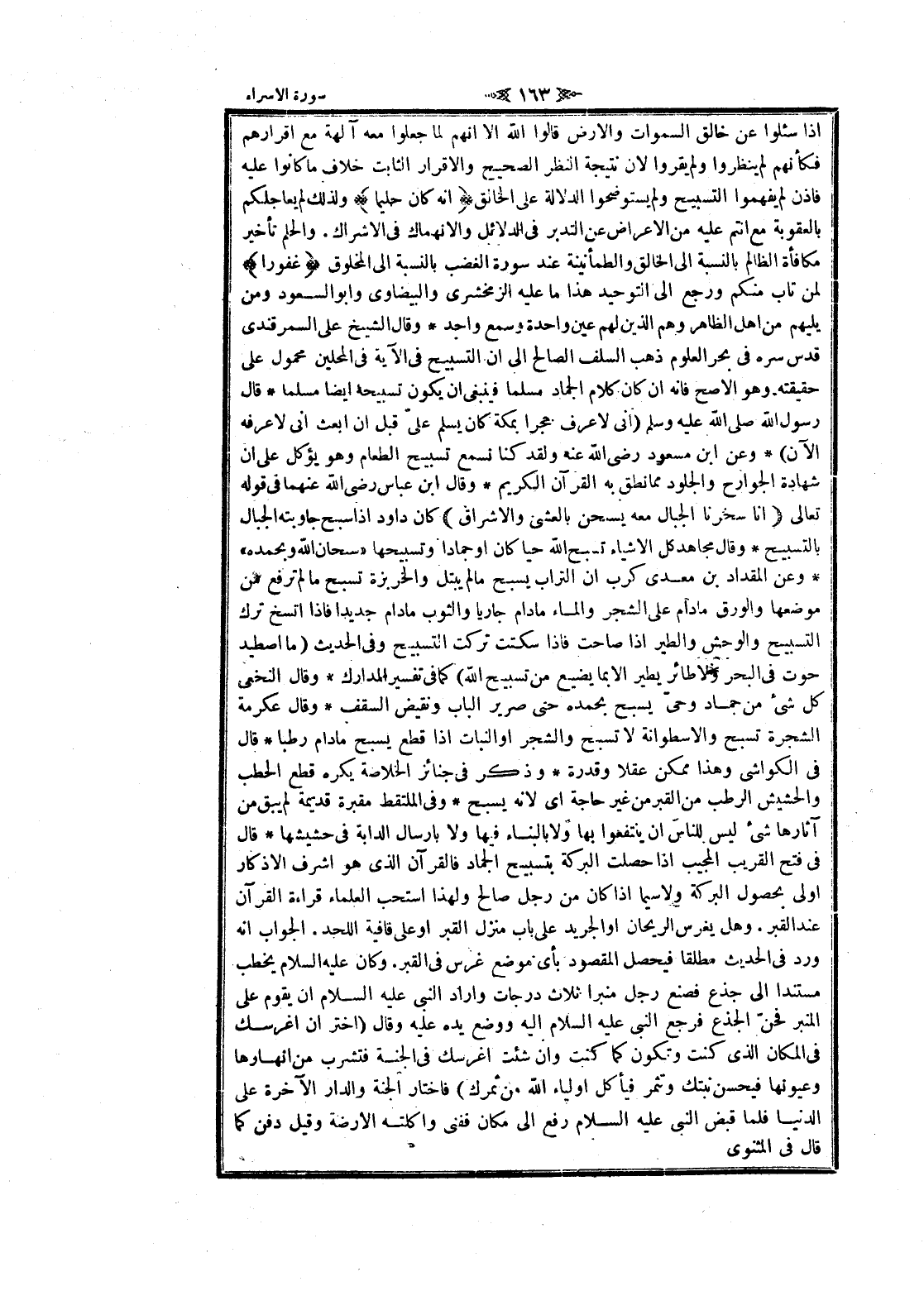 إذا سئلوا عن خالق السموات والأرض قالوا الله الا انهم لما جعلوا معه آلهة مع إقرارهم فكأنهم لم ينظروا ولم يقروا لان نتيجة النظر الصحيح والإقرار الثابت خلاف ما كانوا عليه فاذن لم يفهموا التسبيح ولم يستوضحوا الدلالة على الخالق إِنَّهُ كانَ حَلِيماً ولذلك لم يعاجلكم بالعقوبة مع أنتم عليه من الاعراض عن التدبر فى الدلائل والانهماك فى الإشراك. والحلم تأخير مكافأة الظالم بالنسبة الى الخالق والطمأنينة عند سورة الغضب بالنسبة الى المخلوق غَفُوراً لمن تاب منكم ورجع الى التوحيد هذا ما عليه الزمخشري والبيضاوي وابو السعود ومن يليهم من اهل الظاهر وهم الذين لهم عين واحدة وسمع واحد وقال الشيخ على السمرقندي قدس سره فى بحر العلوم ذهب السلف الصالح الى ان التسبيح فى الآية فى المحلين محمول على حقيقته وهو الأصح فانه ان كان كلام الجماد مسلما فينبغى ان يكون تسبيحه ايضا مسلما قال رسول الله صلى الله عليه وسلم (انى لا عرف حجرا بمكة كان يسلم علىّ قبل ان ابعث انى لا عرفه الآن) وعن ابن مسعود رضى الله عنه ولقد كنا نسمع تسبيح الطعام وهو يؤكل على ان شهادة الجوارح والجلود مما نطق به القرآن الكريم وقال ابن عباس رضى الله عنهما فى قوله تعالى إِنَّا سَخَّرْنَا الْجِبالَ مَعَهُ يُسَبِّحْنَ بِالْعَشِيِّ وَالْإِشْراقِ كان داود إذا سبح جاوبته الجبال بالتسبيح وقال مجاهد كل الأشياء تسبح الله حيا كان او جمادا وتسبيحها «سبحان الله وبحمده» وعن المقداد بن معدى كرب ان التراب يسبح ما لم يبتل والخربزة تسبح ما لم ترفع من موضعها والورق مادام على الشجر والماء مادام جاريا والثوب مادام جديدا فاذا اتسخ ترك التسبيح والوحش والطير إذا صاحت فاذا سكتت تركت التسبيح وفى الحديث (ما اصطيد حوت فى البحر ولا طائر يطير الا بما يضيع من تسبيح الله) كما فى تفسير المدارك وقال النخعي كل شىء من جماد وحىّ يسبح بحمده حتى صرير الباب ونقيض السقف وقال عكرمة الشجرة تسبح والاسطوانة لا تسبح والشجر او النبات إذا قطع يسبح مادام رطبا قال فى الكواشي وهذا ممكن عقلا وقدرة وذكر فى جنائز الخلاصة يكره قطع الحطب والحشيش الرطب من القبر من غير حاجة اى لانه يسبح وفى الملتقط مقبرة قديمة لم يبق من آثارها شىء ليس للناس ان ينتفعوا بها ولا بالبناء فيها ولا بإرسال الدابة فى حشيشها قال فى فتح القريب المجيب إذا حصلت البركة بتسبيح الجماد فالقرآن الذي هو اشرف الاذكار اولى بحصول البركة ولا سيما إذا كان من رجل صالح ولهذا استحب العلماء قراءة القرآن عند القبر. وهل يغرس الريحان او الجريد على باب منزل القبر او على قافية اللحد. الجواب انه ورد فى الحديث مطلقا فيحصل المقصود بأى موضع غرس فى القبر. وكان عليه السلام يخطب مستندا الى جذع فصنع رجل منبرا ثلاث درجات وأراد النبي عليه السلام ان يقوم على المنبر فحنّ الجذع فرجع النبي عليه السلام اليه ووضع يده عليه وقال (اختر ان اغرسك فى المكان الذي كنت وتكون كما كنت وان شئت اغرسك فى الجنة فتشرب من أنهارها وعيونها فيحسن نبتك وتثمر فيأكل اولياء الله من ثمرك) فاختار الجنة والدار الآخرة على الدنيا فلما قبض النبي عليه السلام رفع الى مكان ففنى وأكلته الارضة وقيل دفن كما قال فى المثنوى