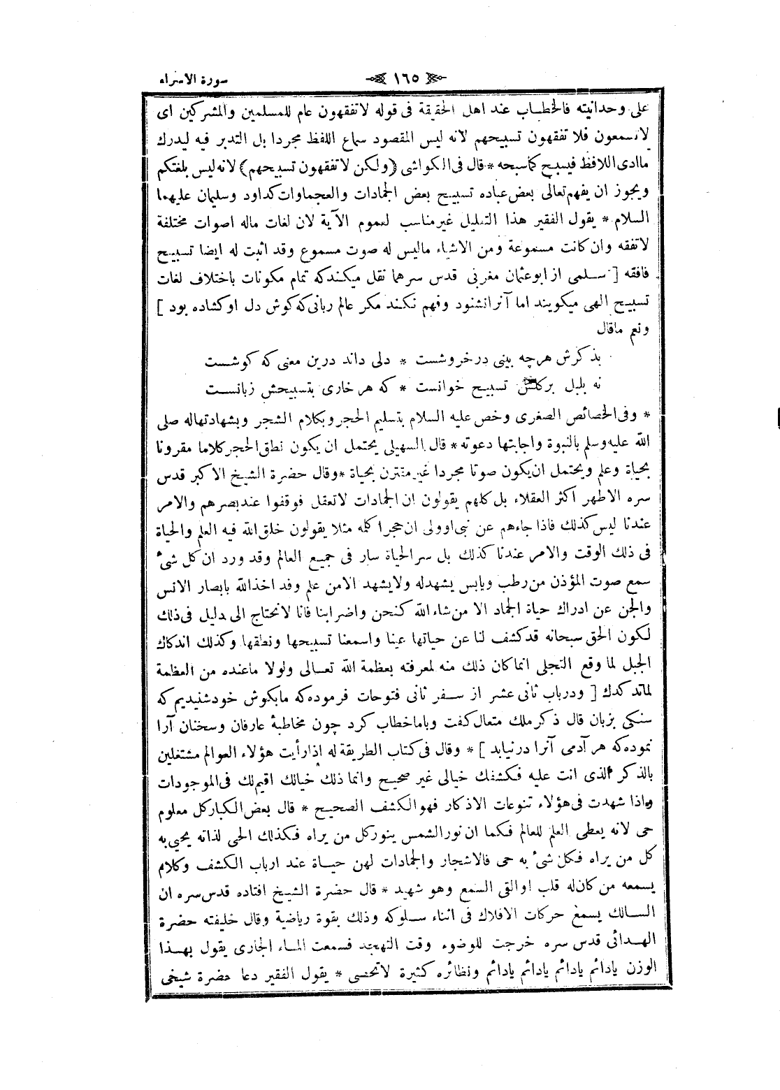 وفى الخصائص الصغرى وخص عليه السلام بتسليم الحجر وبكلام الشجر وبشهادتها له صلى الله عليه وسلم بالنبوة وإجابتها دعوته قال السهيلي يحتمل ان يكون نطق الحجر كلاما مقرونا بحياة وعلم ويحتمل ان يكون صوتا مجردا غير مقترن بحياة وقال حضرة الشيخ الأكبر قدس سره الأطهر اكثر العقلاء بل كلهم يقولون ان الجمادات لا تعقل فوقفوا عند بصرهم والأمر عندنا ليس كذلك فاذا جاءهم عن نبى او ولى ان حجرا كلمه مثلا يقولون خلق الله فيه العلم والحياة فى ذلك الوقت والأمر عندنا كذلك بل سر الحياة سار فى جميع العالم وقد ورد ان كل شىء سمع صوت المؤذن من رطب ويابس يشهد له ولا يشهد الا من علم وقد أخذ الله بابصار الانس والجن عن ادراك حياة الجماد الا من شاء الله كنحن واضرابنا فانا لا نحتاج الى دليل فى ذلك لكون الحق سبحانه قد كشف لنا عن حياتها عينا وأسمعنا تسبيحها ونطقها وكذلك اندكاك الجبل لما وقع التجلي انما كان ذلك منه لمعرفته بعظمة الله تعالى ولولا ما عنده من العظمة لما تد كدك [ودر باب ثانى عشر از سفر ثانى فتوحات فرموده كه ما بكوش خود شنيديم كه سنكى بزبان قال ذكر ملك متعال گفت وبا ما خطاب كرد چون مخاطبه عارفان وسخنان آرا نموده كه هر آدمي آنرا در نيابد] وقال فى كتاب الطريقة له إذا رأيت هؤلاء العوالم مشتغلين بالذكر الذي أنت عليه فكشفك خيالى غير صحيح وانما ذلك خيالك أقيم لك فى الموجودات وإذا شهدت فى هؤلاء تنوعات الاذكار فهو الكشف الصحيح قال بعض الكبار كل معلوم حى لانه يعطى العلم للعالم فكما ان نور الشمس ينور كل من يراه فكذلك الحي لذاته يحيى به كل من يراه فكل شىء به حى فالاشجار والجمادات لهن حياة عند ارباب الكشف وكلام يسمعه من كان له قلب او القى السمع وهو شهيد قال حضرة الشيخ افتاده قدس سره ان السالك يسمع حركات الافلاك فى أثناء سلوكه وذلك بقوة رياضية وقال خليفته حضرة الهدائى قدس سره خرجت للوضوء وقت التهجد فسمعت الماء الجاري يقول بهذا الوزن يا دائم يا دائم يا دائم يا دائم ونظائره كثيرة لا تحصى يقول الفقير دعا حضرة شيخى