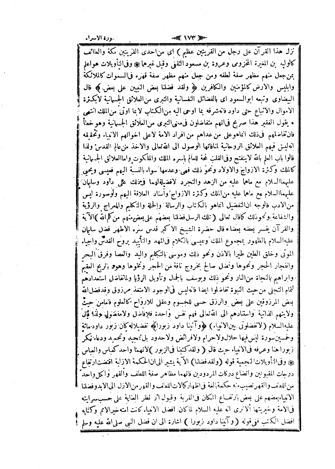 والملكوت واما العلائق الجسمانية كالملك وكثرة الأزواج والأولاد ونحو ذلك فهى وعدمها سواء بالنسبة إليهم فعيسى ويحيى عليهما السلام مع ماهما عليه من الزهد والتجرد لا فضيلة لهما فى ذلك على داود وسليمان عليهما السلام مع ماهما عليه من الملك وكثرة الأزواج واسناد العلاقة إليهم ولو صورة ليس من الأدب فالوجه ان التفضيل انما هو بالكتاب والرسالة والخلة والتكليم والمعراج والرؤية والشفاعة ونحو ذلك كما قال تعالى تِلْكَ الرُّسُلُ فَضَّلْنا بَعْضَهُمْ عَلى بَعْضٍ مِنْهُمْ مَنْ كَلَّمَ اللَّهُ الاية والقرآن يفسر بعضه بعضا قال حضرة الشيخ الأكبر قدس سره الأطهر فضل سليمان عليه السلام بالظهور بمجموع الملك وعيسى بالكلام فى المهد والتأييد بروح القدس واحياء الموتى وخلق الطين طيرا بالاذن ونحو ذلك وموسى بالتكليم واليد والعصا وفرق البحر وانفجار الحجر ونحوها وفضل صالح بخروج ناقة من الحجر ونحوها وهود بالريح العقيم وابراهيم بالنجاة من النار ونحو ذلك ويوسف بالجمال وتأويل الرؤيا ولما تفاضل استعدادهم لتمام التجلي من حيث النبوة تفاضلوا ايضا فانه ليس فى الوجود الا متغذ مرزوق وقد فضل الله بعض المرزوقين على بعض والرزق حسى للجسوم وعقلى للارواح كالعلوم فاما من حيث ولايتهم الذاتية واستنادهم الى الله تعالى فهم نفس واحدة فلا فاضل ولا مفضول ولذا قال عليه السلام (لا تفضلونى بين الأنبياء) وَآتَيْنا داوُدَ زَبُوراً تفضيلا له كان زبور داود مائة وخمسين سورة ليس فيها حلال ولا حرام ولا فرائض ولا حدود بل تمجيد وتحميد ودعاء نكر زبورا هنا وعرفه فى الأنبياء حيث قال وَلَقَدْ كَتَبْنا فِي الزَّبُورِ لانهما واحد كعباس والعباس وفى التأويلات النجمية قوله وَلَقَدْ فَضَّلْنا الآية يشير الى ان الحكمة الازلية اقتضت ارتفاع درجات المقبولين واتضاع دركات المردودين فانهما مظاهر صفة اللطف والقهر ولكل واحد من اللطف والقهر نصيب منه حكمة بالغة فى اظهار كمالات اللطف والقهر من الأزل الى الابد وفضلنا الأنبياء بعضهم على بعض بارتفاع المكان فى القربة وقبول از نظر العناية على حسب سرايته فى الامة وخيريتها ألا ترى انه عليه السلام لما كان أفضل الأنبياء كانت أمته خير الأمم وكتابه أفضل الكتب ففى قوله وَآتَيْنا داوُدَ زَبُوراً اشارة الى ان فضل النبي صلى الله عليه وسلم