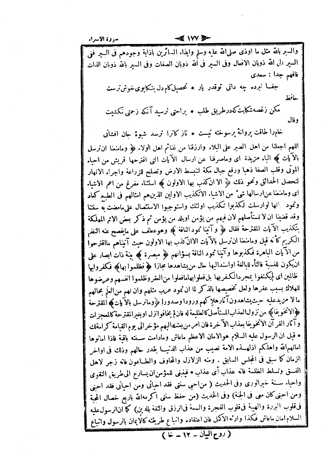 اللهم اجعلنا من اهل الصبر على البلاء وارزقنا من غنائم اهل الولاء وَما مَنَعَنا أَنْ نُرْسِلَ بِالْآياتِ الباء مزيدة اى وما صرفنا عن إرسال الآيات التي اقترحها قريش من احياء الموتى وقلب الصفا ذهبا ورفع جبال مكة لتنبسط الأرض وتصلح للزراعة واجراء الأنهار لتحصل الحدائق ونحو ذلك إِلَّا أَنْ كَذَّبَ بِهَا الْأَوَّلُونَ استثناء مفرغ من أعم الأشياء اى وما منعنا عن إرسالها شىء من الأشياء الا تكذيب الأولين الذين هم أمثالهم فى الطبع كعاد وثمود وانها لو أرسلت لكذبوا تكذيب أولئك واستوجبوا الاستئصال على ما مضت به سنتنا وقد قضينا ان لا نستأصلهم لان فيهم من يؤمن أو يلد من يؤمن ثم ذكر بعض الأمم المهلكة بتكذيب الآيات المقترحة فقال وَآتَيْنا ثَمُودَ النَّاقَةَ وهو عطف على ما يفصح عنه النظم الكريم كأنه قيل وما منعنا ان نرسل بالآيات الا ان كذب بها الأولون حيث آتيناهم ما اقترحوا من الآيات الباهرة فكذبوها وآتينا ثمود الناقة بسؤالهم مُبْصِرَةً بينة ذات أبصار على ان يكون للنسبة فالتاء للبالغة او أسند إليها حال من يشاهدها مجازا فَظَلَمُوا بِها فكفروا بها ظالمين اى لم يكتفوا بمجرد الكفر بها بل فعلوا بها ما فعلوا من العقر وظلموا أنفسهم وعرضوها للهلاك بسبب عقرها ولعل تخصيصها بالذكر لما ان ثمود عرب مثلهم وان لهم من العلم بحالهم ما لا مزيد عليه حيث يشاهدون آثار هلاكهم ورودا وصدورا وَما نُرْسِلُ بِالْآياتِ المقترحة إِلَّا تَخْوِيفاً من نزول العذاب المستأصل كالطليعة له فان لم يخافوا انزل او بغير المقترحة كالمعجزات وآثار القرآن الا تخويفا بعذاب الآخرة فان امر من بعثت إليهم مؤخر الى يوم القيامة كرامة لك قيل ان الرسول عليه السلام هو الامان الأعظم ما عاش وما دامت سنته باقية فاذا اماتوها أماتهم الله وأهلكهم إذ لهذه الامة نصيب من عذاب الدنيا بقدر حالهم وذلك فى اواخر الزمان كما سبق فى المجلس السابق. ومنه الزلازل والمخاوف والطاعون فانه زجر لاهل الفسق وتسلط الظلمة فانه عذاب أي عذاب فينبغى للمؤمن ان يسارع الى طريق التقوى واحياء سنة خير الورى وفى الحديث (من احيى سنتى فقد أحياني ومن أحياني فقد أحبني ومن أحبني كان معى فى الجنة) وفى الحديث (من حفظ سنتى أكرمه الله بأربع خصال المحبة فى قلوب البررة والهيبة فى قلوب الفجرة والسعة فى الرزق والثقة بالدين) كما ان الرسول عليه السلام أمان ما عاش فكذا وارثه الأكمل فان اعتقاده واتباع طريقته كالايمان بالرسول واتباع