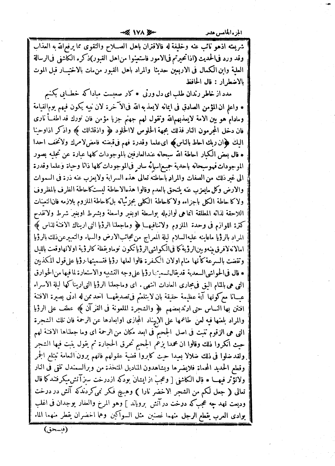 واعلم ان المؤمن الصادق فى إيمانه لا يعذبه الله فى الآخرة لان نبيه يكون فيهم يوم القيامة ومادام هو بين الامة لا يعذبهم الله وتقول لهم جهنم جزيا مؤمن فان نورك قد اطفأ نارى فان دخل المجرمون النار فذلك بجهة الخلوص لا الخلود وَإِذْ قُلْنا لَكَ واذكر إذ أوحينا إليك إِنَّ رَبَّكَ أَحاطَ بِالنَّاسِ اى علما وقدرة فهم فى قبضته فامض لامرك ولا تخف أحدا قال بعض الكبار احاطة الله سبحانه عند العارفين بالموجودات كلها عبارة عن تجليه بصور الموجودات فهو سبحانه بأحدية جميع أسمائه سار فى الموجودات كلها ذاتا وحياة وعلما وقدرة الى غير ذلك من الصفات والمراد بإحاطته تعالى هذه السراية ولا يعزب عنه ذرة فى السموات والأرض وكل ما يعزب عنه يلتحق بالعدم وقالوا هذه الإحاطة ليست كاحاطة الظرف بالمظروف ولا كاحاطة الكل بأجزائه ولا كاحاطة الكلى بجزئياته بل كاحاطة الملزوم بلازمه فان التعينات اللاحقة لذاته المطلقة انما هى لوازم له بواسطة او بغير واسطة وبشرط او بغير شرط ولا تقدح كثرة اللوازم فى وحدة الملزوم ولا تنافيها وَما جَعَلْنَا الرُّؤْيَا الَّتِي أَرَيْناكَ إِلَّا فِتْنَةً لِلنَّاسِ المراد بالرؤيا ما عاينه عليه السلام ليلة المعراج من عجائب الأرض والسماء والتعبير عن ذلك بالرؤيا اما لانه لا فرق بينه وبين الرؤية كما فى الكواشي الرؤيا تكون نوما ويقظة كالرؤية او لانها وقعت بالليل وتقضت بالسرعة كأنها منام او لان الكفرة قالوا لعلها رؤيا فتسميتها رؤيا على قول المكذبين قال فى الحواشي السعدية قد يقال تسميتها رؤيا على وجه التشبيه والاستعارة لما فيها من الخوارق التي هى بالمنام أليق فى مجارى العادات انتهى. اى وما جعلنا الرؤيا التي اريناكها ليلة الاسراء عيانا مع كونها آية عظيمة حقيقة بان لا يتلعثم فى تصديقها أحد ممن له ادنى بصيرة الا فتنة افتتن بها الناس حتى ارتد بعضهم وَالشَّجَرَةَ الْمَلْعُونَةَ فِي الْقُرْآنِ عطف على الرؤيا والمراد بلعنها فيه لعن طاعمها على الاسناد المجازى او ابعادها عن الرحمة فان تلك الشجرة التي هى الزقوم تنبت فى اصل الجحيم فى ابعد مكان من الرحمة اى وما جعلناها الا فتنة لهم حيث أنكروا ذلك وقالوا ان محمدا يزعم الجحيم تحرق الحجارة ثم يقول ينبت فيها الشجر ولقد ضلوا فى ذلك ضلالا بعيدا حيث كابروا قضية عقولهم فانهم يرون النعامة تبتلع الجمر وقطع الحديد المحماة فلا يضرها ويشاهدون المناديل المتخذة من وبر السمندل تلقى فى النار ولا تؤثر فيها قال الكاشفى [وعجب از ايشان بود كه از درخت سبز آتش ميكرفتند كما قال تعالى جَعَلَ لَكُمْ مِنَ الشَّجَرِ الْأَخْضَرِ ناراً وهيچ فكر نمى كردند كه آتش در درخت وديعت نهد چهـ عجب كه درخت در آتش بروياند] وهو المرخ والعفار يوجدان فى اغلب بوادي العرب يقطع الرجل منهما غصنين مثل السواكين وهما أخضران يقطر منهما الماء