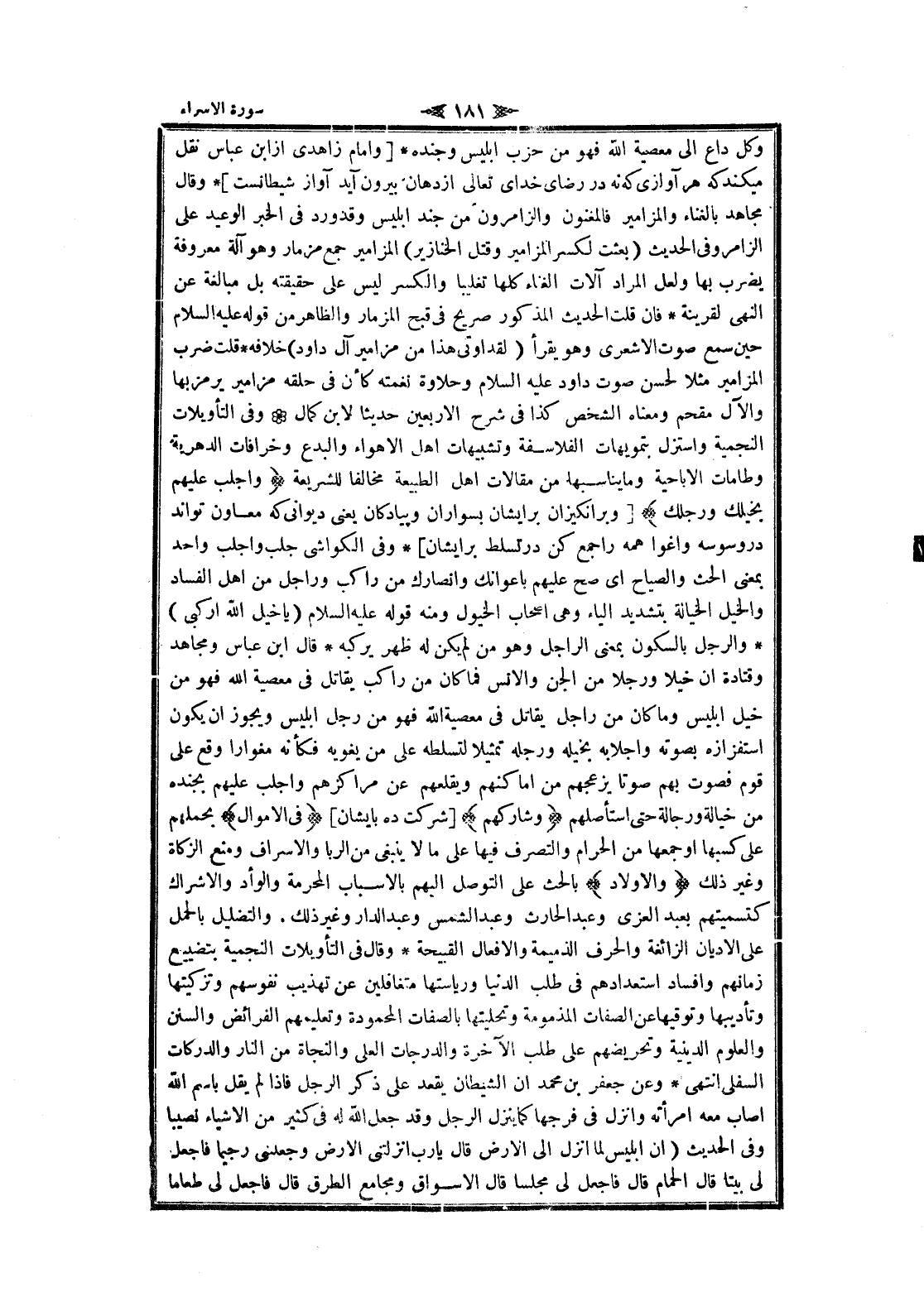 وكل داع الى معصية الله فهو من حزب إبليس وجنده [وامام زاهدى از ابن عباس نقل ميكند كه هر آوازى كه نه در رضاى خداى تعالى از دهان بيرون آيد آواز شيطانست] وقال مجاهد بالغناء والمزامير فالمغنون والزامرون من جند إبليس وقد ورد فى الخبر الوعيد على الزام وفى الحديث (بعثت لكسر المزامير وقتل الخنازير) المزامير جمع مزمار وهو آلة معروفة يضرب بها ولعل المراد آلات الغناء كلها تغليبا والكسر ليس على حقيقته بل مبالغة عن النهى لقرينة فان قلت الحديث المذكور صريح فى قبح المزمار والظاهر من قوله عليه السلام حين سمع صوت الأشعري وهو يقرأ (لقد اوتى هذا من مزامير آل داود) خلافه قلت ضرب المزامير مثلا لحسن صوت داود عليه السلام وحلاوة نغمته كأن فى حلقه مزامير يرمزبها والآل مقحم ومعناه الشخص كذا فى شرح الأربعين حديثا لابن كمال وفى التأويلات النجمية واستنزل بتمويهات الفلاسفة وتشبيهات اهل الأهواء والبدع وخرافات الدهرية وطامات الإباحية وما يناسبها من مقالات اهل الطبيعة مخالفا للشريعة وَأَجْلِبْ عَلَيْهِمْ بِخَيْلِكَ وَرَجِلِكَ [وبرانگيزان بر ايشان بسواران و پيادگان يعنى ديوانى كه معاون تواند در وسوسه واغوا همه را جمع كن در تسلط بر ايشان] وفى الكواشي جلب واجلب واحد بمعنى الحث والصياح اى صح عليهم باعوانك وأنصارك من راكب وراجل من اهل الفساد والخيل الخيالة بتشديد الياء وهى اصحاب الخيول ومنه قوله عليه السلام (يا خيل الله اركبي) والرجل بالسكون بمعنى الراجل وهو من لم يكن له ظهر يركبه قال ابن عباس ومجاهد وقتادة ان خيلا ورجلا من الجن والانس فما كان من راكب يقاتل فى معصية الله فهو من خيل إبليس وما كان من راجل يقاتل فى معصية الله فهو من رجل إبليس ويجوز ان يكون استفزازه بصوته واجلابه بخيله ورجله تمثيلا لتسلطه على من يغويه فكأنه مغوارا وقع على قوم فصوت بهم صوتا يزعجهم من أماكنهم ويقلعهم عن مراكزهم واجلب عليهم بجنده من خيالة ورجالة حتى استأصلهم وَشارِكْهُمْ [شركت ده بايشان] فِي الْأَمْوالِ بحملهم على كسبها او جمعها من الحرام والتصرف فيها على ما لا ينبغى من الربا والإسراف ومنع الزكاة وغير ذلك وَالْأَوْلادِ بالحث على التوصل إليهم بالأسباب المحرمة والوأد والإشراك كتسسينهم بعبد العزى وعبد الحارث وعبد الشمس وعبد الدار وغير ذلك. والتضليل بالحمل على الأديان الزائغة والحرف الذميمة والافعال القبيحة وقال فى التأويلات النجمية بتضييع زمانهم وإفساد استعدادهم فى طلب الدنيا ورياستها متغافلين عن تهذيب نفوسهم وتزكيتها وتأديبها وتوقيها عن الصفات المذمومة وتحليتها بالصفات المحمودة وتعليمهم الفرائض والسنن والعلوم الدينية وتحريضهم على طلب الآخرة والدرجات العلى والنجاة من النار والدركات السفلى انتهى وعن جعفر بن محمد ان الشيطان يقعد على ذكر الرجل فاذا لم يقل باسم الله أصاب معه امرأته وانزل فى فرجها كما ينزل الرجل وقد جعل الله له فى كثير من الأشياء نصيبا وفى الحديث (ان إبليس لما انزل الى الأرض قال يا رب أنزلتني الأرض وجعلتنى رجيما فاجعل لى بيتا قال الحمام قال فاجعل لى مجلسا قال الأسواق ومجامع الطرق قال فاجعل لى طعاما