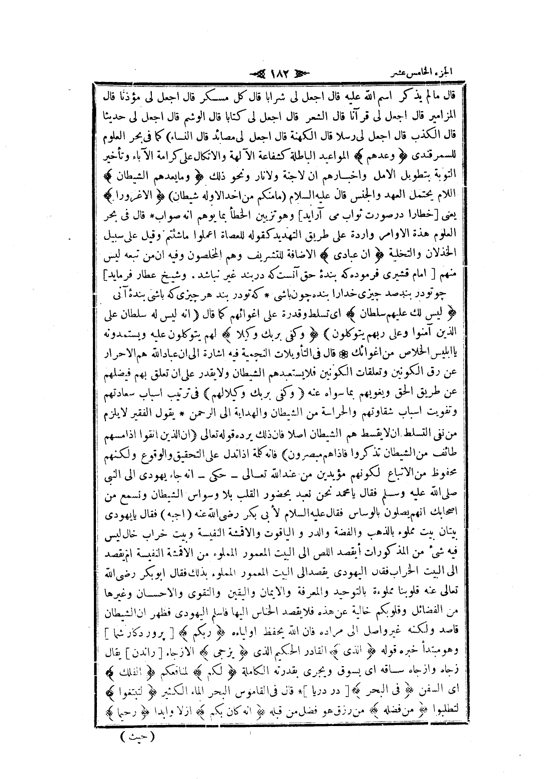 قال ما لم يذكر اسم الله عليه قال اجعل لى شرابا قال كل مسكر قال اجعل لى مؤذنا قال المزامير قال اجعل لى قرآنا قال الشعر قال اجعل لى كتابا قال الوشم قال اجعل لى حديثا قال الكذب قال اجعل لى رسلا قال الكهنة قال اجعل لى مصائد قال النساء) كما فى بحر العلوم للسمرقندى وَعِدْهُمْ المواعيد الباطلة كشفاعة الآلهة والاتكال على كرامة الآباء وتأخير التوبة بتطويل الأمل واخبارهم ان لا جنة ولا نار ونحو ذلك وَما يَعِدُهُمُ الشَّيْطانُ اللام يحتمل العهد والجنس قال عليه السلام (ما منكم من أحد الا وله شيطان) إِلَّا غُرُوراً يعنى [خطا را در صورت ثواب مى آرايد] وهو تزيين الخطأ بما يوهم انه صواب قال فى بحر العلوم هذة الأوامر واردة على طريق التهديد كقوله للعصاة اعملوا ما شئتم وقيل على سبيل الخذلان والتخلية إِنَّ عِبادِي الاضافة للتشريف وهم المخلصون وفيه ان من تبعه ليس منهم [امام قشيرى فرموده كه بنده حق آنست كه در بند غير نباشد. وشيخ عطار فرمايد]