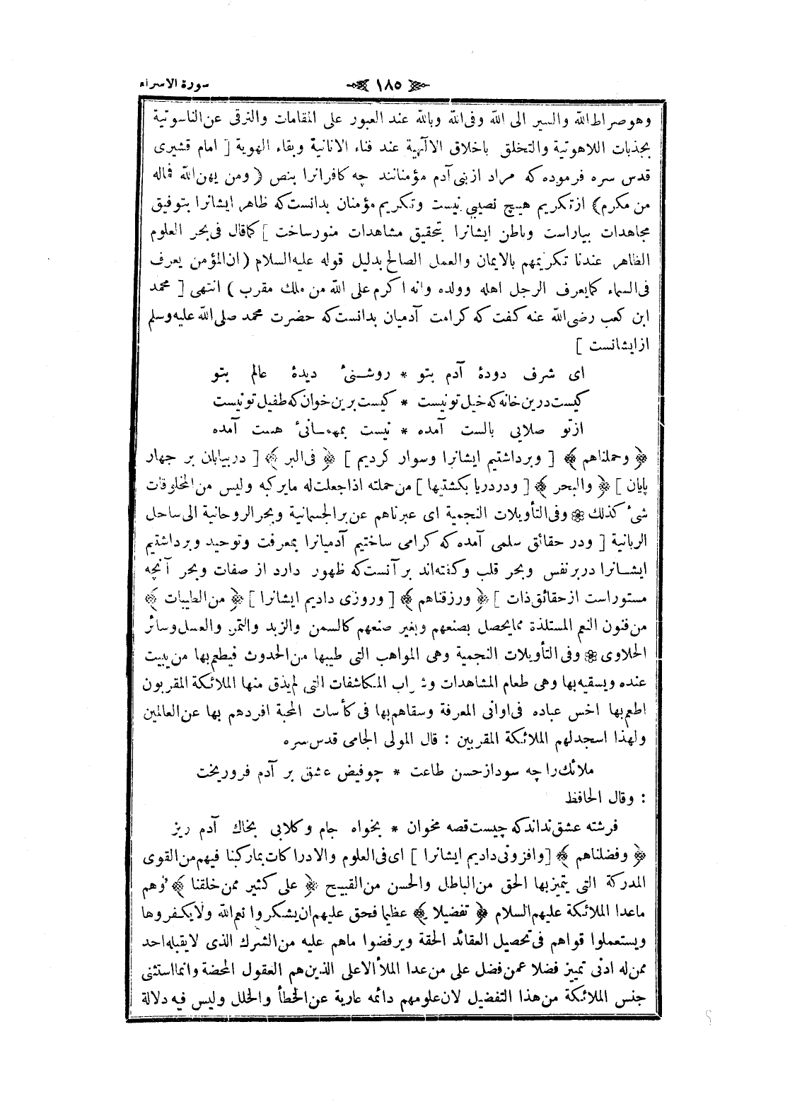 وهو صراط الله والسير الى الله وفى الله وبالله عند العبور على المقامات والترقي عن الناسوتية بجذبات اللاهوتية والتخلق بأخلاق الالهية عند فناء الانانية وبقاء الهوية [امام قشيرى قدس سره فرموده كه مراد از بنى آدم مؤمنانند چهـ كافرانرا بنص وَمَنْ يُهِنِ اللَّهُ فَما لَهُ مِنْ مُكْرِمٍ از تكريم هيچ نصيبى نيست وتكريم مؤمنان بدانست كه ظاهر ايشانرا بتوفيق مجاهدات بياراست وباطن ايشانرا بتحقيق مشاهدات منور ساخت] كما قال فى بحر العلوم الظاهر عندنا تكريمهم بالايمان والعمل الصالح بدليل قوله عليه السلام (ان المؤمن يعرف فى السماء كما يعرف الرجل اهله وولده وانه أكرم على الله من ملك مقرب) انتهى [محمد ابن كعب رضى الله عنه گفت كه كرامت آدميان بدانست كه حضرت محمد صلى الله عليه وسلم از ايشانست]
