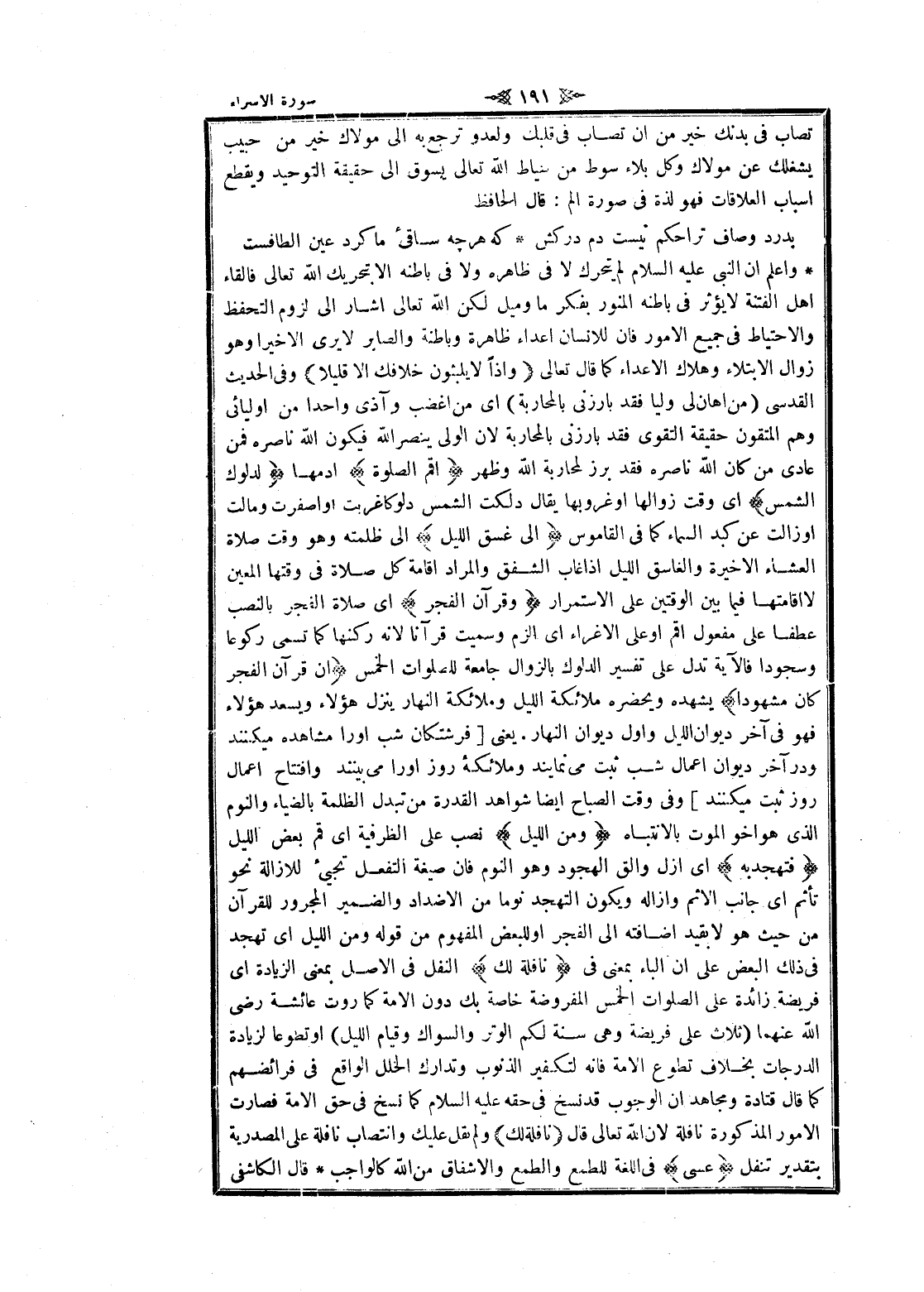 واعلم ان النبي عليه السلام لم يتحرك لا فى ظاهره ولا فى باطنه الا بتحريك الله تعالى فالقاء اهل الفتنة لا يؤثر فى باطنه المنور بفكر ما وميل لكن الله تعالى أشار الى لزوم التحفظ والاحتياط فى جميع الأمور فان للانسان اعداء ظاهرة وباطنة والصابر لا يرى إلا خيرا وهو زوال الابتلاء وهلاك الأعداء كما قال تعالى وَإِذاً لا يَلْبَثُونَ خِلافَكَ إِلَّا قَلِيلًا وفى الحديث القدسي (من أهان لى وليا فقد بارزني بالمحاربة) اى من اغضب وآذى واحدا من أوليائي وهم المتقون حقيقة التقوى فقد بارزني بالمحاربة لان الولي ينصر الله فيكون الله ناصره فمن عادى من كان الله ناصره فقد برز لمحاربة الله وظهر أَقِمِ الصَّلاةَ ادمها لِدُلُوكِ الشَّمْسِ اى وقت زوالها او غروبها يقال دلكت الشمس دلوكا غربت او اصفرت ومالت او زالت عن كبد السماء كما فى القاموس إِلى غَسَقِ اللَّيْلِ الى ظلمته وهو وقت صلاة العشاء الاخيرة والغاسق الليل إذا غاب الشفق والمراد اقامة كل صلاة فى وقتها المعين لا إقامتها فيما بين الوقتين على الاستمرار وَقُرْآنَ الْفَجْرِ اى صلاة الفجر بالنصب عطفا على مفعول أقم او على الإغراء اى الزم وسميت قرآنا لانه ركنها كما تسمى ركوعا وسجودا فالآية تدل على تفسير الدلوك بالزوال جامعة للصلوات الخمس إِنَّ قُرْآنَ الْفَجْرِ كانَ مَشْهُوداً يشهده ويحضره ملائكة الليل وملائكة النهار ينزل هؤلاء ويسعد هؤلاء فهو فى آخر ديوان الليل وأول ديوان النهار. يعنى [فرشتكان شب او را مشاهده ميكنند ودر آخر ديوان اعمال شب ثبت مى نمايند وملائكه روز او را مى بينند وافتتاح اعمال روز ثبت ميكنند] وفى وقت الصباح ايضا شواهد القدرة من تبدل الظلمة بالضياء والنوم الذي هو أخو الموت بالانتباه وَمِنَ اللَّيْلِ نصب على الظرفية اى قم بعض الليل فَتَهَجَّدْ بِهِ اى ازل والق الهجود وهو النوم فان صيغة التفعل تجيئ للازالة نحو تأثم اى جانب الإثم وازاله ويكون التهجد نوما من الاضداد والضمير المجرور للقرآن من حيث هو لا بقيد إضافته الى الفجر او للبعض المفهوم من قوله ومن الليل اى تهجد فى ذلك البعض على ان الباء بمعنى فى نافِلَةً لَكَ النفل فى الأصل بمعنى الزيادة اى فريضة زائدة على الصلوات الخمس المفروضة خاصة بك دون الامة كما روت عائشة رضى الله عنهما (ثلاث على فريضة وهى سنة لكم الوتر والسواك وقيام الليل) او تطوعا لزيادة الدرجات بخلاف تطوع الامة فانه لتكفير الذنوب وتدارك الخلل الواقع فى فرائضهم كما قال قتادة ومجاهد ان الوجوب قد نسخ فى حقه عليه السلام كما نسخ فى حق الامة فصارت الأمور المذكورة نافلة لان الله تعالى قال نافِلَةً لَكَ ولم يقل عليك وانتصاب نافلة على المصدرية بتقدير تنفل عَسى فى اللغة للطمع والطمع والإشفاق من الله كالواجب قال الكاشفى