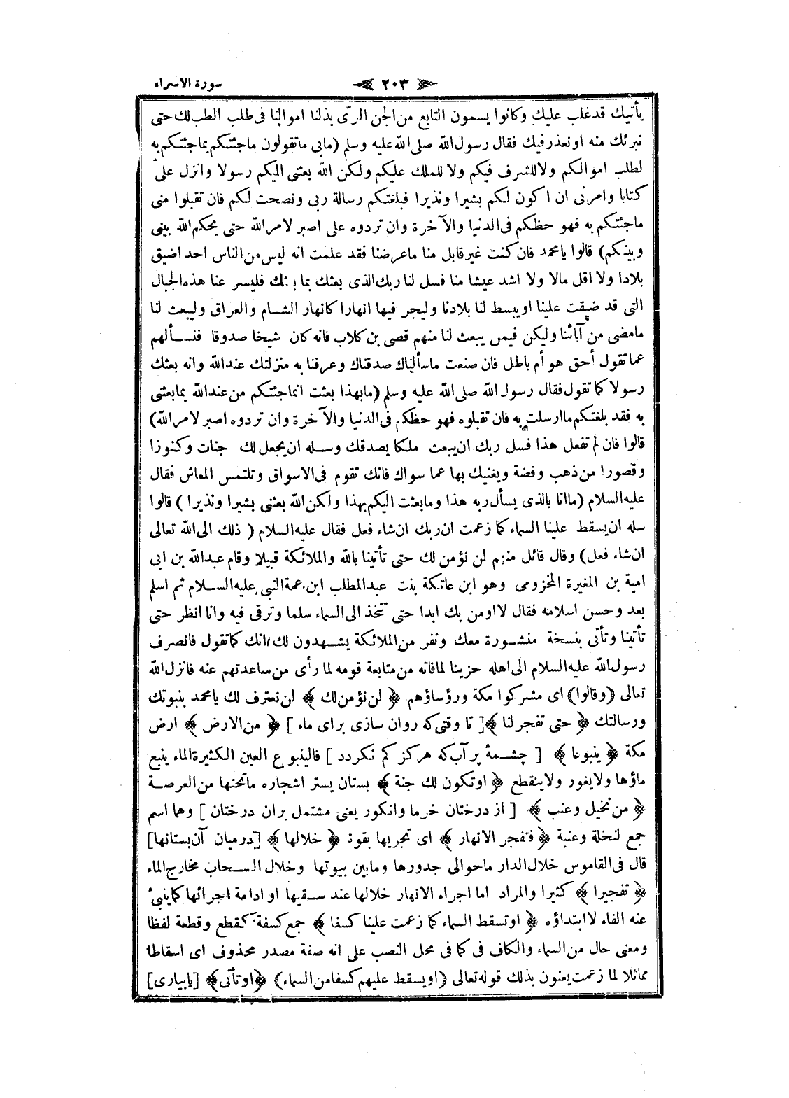 يأتيك قد غلب عليك وكانوا يسمون التابع من الجن الرّى بذلنا أموالنا فى طلب الطب لك حتى نبرئك منه او نعذر فيك فقال رسول الله صلى الله عليه وسلم (ما بي ما تقولون ما جئتكم بما جئتكم به لطلب أموالكم ولا للشرف فيكم ولا للملك عليكم ولكن الله بعثني إليكم رسولا وانزل على كتابا وأمرني ان أكون لكم بشيرا ونذيرا فبلغتكم رسالة ربى ونصحت لكم فان تقبلوا منى ما جئتكم به فهو حظكم فى الدنيا والآخرة وان تردوه على اصبر لامر الله حتى يحكم الله بينى وبينكم) قالوا يا محمد فان كنت غير قابل منا ما عرضنا فقد علمت انه ليس من الناس أحد أضيق بلادا ولا اقل مالا ولا أشد عيشا منا فسل لنا ربك الذي بعثك بما بعثك فليسر عنا هذه الجبال التي قد ضيقت علينا او يبسط لنا بلادنا وليجر فيها أنهارا كانهار الشام والعراق وليبعث لنا ما مضى من آبائنا وليكن فيمن يبعث لنا منهم قصى بن كلاب فانه كان شيخا صدوقا فنسألهم عما تقول أحق هو أم باطل فان صنعت ما سألناك صدقناك وعرفنا به منزلتك عند الله وانه بعثك رسولا كما تقول فقال رسول الله صلى الله عليه وسلم (ما بهذا بعثت انما جئتكم من عند الله بما بعثني به فقد بلغتكم ما أرسلت به فان تقبلوه فهو حظكم فى الدنيا والآخرة وان تردوه اصبر لامر الله) قالوا فان لم تفعل هذا فسل ربك ان يبعث ملكا يصدقك وسله ان يجعل لك جنات وكنوزا وقصورا من ذهب وفضة ويغنيك بها عما سواك فانك تقوم فى الأسواق وتلتمس المعاش فقال عليه السلام (ما انا بالذي يسأل ربه هذا وما بعثت إليكم بهذا ولكن الله بعثني بشيرا ونذيرا) قالوا سله ان يسقط علينا السماء كما زعمت ان ربك ان شاء فعل فقال عليه السلام (ذلك الى الله تعالى ان شاء فعل) وقال قائل منهم لن نؤمن لك حتى تأتينا بالله والملائكة قبيلا وقام عبد الله بن ابى امية بن المغيرة المخزومي وهو ابن عاتكة بنت عبد المطلب ابن عمة النبي عليه السلام ثم اسلم بعد وحسن إسلامه فقال لا او من بك ابدا حتى تتخذ الى السماء سلما وترقى فيه وانا انظر حتى تأتينا وتأتى بنسخة منشورة معك ونفر من الملائكة يشهدون لك انك كما تقول فانصرف رسول الله عليه السلام الى اهله حزينا لما فاته من متابعة قومه لما رأى من مباعدتهم عنه فانزل الله تعالى وَقالُوا اى مشركوا مكة ورؤساؤهم لَنْ نُؤْمِنَ لَكَ لن نعترف لك يا محمد بنبوتك ورسالتك حَتَّى تَفْجُرَ لَنا [تا وقتى كه روان سازى براى ماء] مِنَ الْأَرْضِ ارض مكة يَنْبُوعاً [چشمه پر آب كه هركز كم نكردد] فالينبوع العين الكثيرة الماء ينبع ماؤها ولا يغور ولا ينقطع أَوْ تَكُونَ لَكَ جَنَّةٌ بستان يستر أشجاره ما تحتها من العرصة مِنْ نَخِيلٍ وَعِنَبٍ [از درختان خرما وانگور يعنى مشتمل بر ان درختان] وهما اسم جمع لنخلة وعنبة فَتُفَجِّرَ الْأَنْهارَ اى تجريها بقوة خِلالَها [در ميان آن بستانها] قال فى القاموس خلال الدار ما حوالى جدورها وما بين بيوتها وخلال السحاب مخارج الماء تَفْجِيراً كثيرا والمراد اما اجراء الأنهار خلالها عند سقيها او ادامة إجرائها كما ينبئ عنه الفاء لا ابتداؤه أَوْ تُسْقِطَ السَّماءَ كَما زَعَمْتَ عَلَيْنا كِسَفاً جمع كسفة كقطع وقطعة لفظا ومعنى حال من السماء والكاف فى كما فى محل النصب على انه صفة مصدر محذوف اى اسقاطا مماثلا لما زعمت يعنون بذلك قوله تعالى أَوْ نُسْقِطْ عَلَيْهِمْ كِسَفاً مِنَ السَّماءِ أَوْ تَأْتِيَ [يا بيارى]