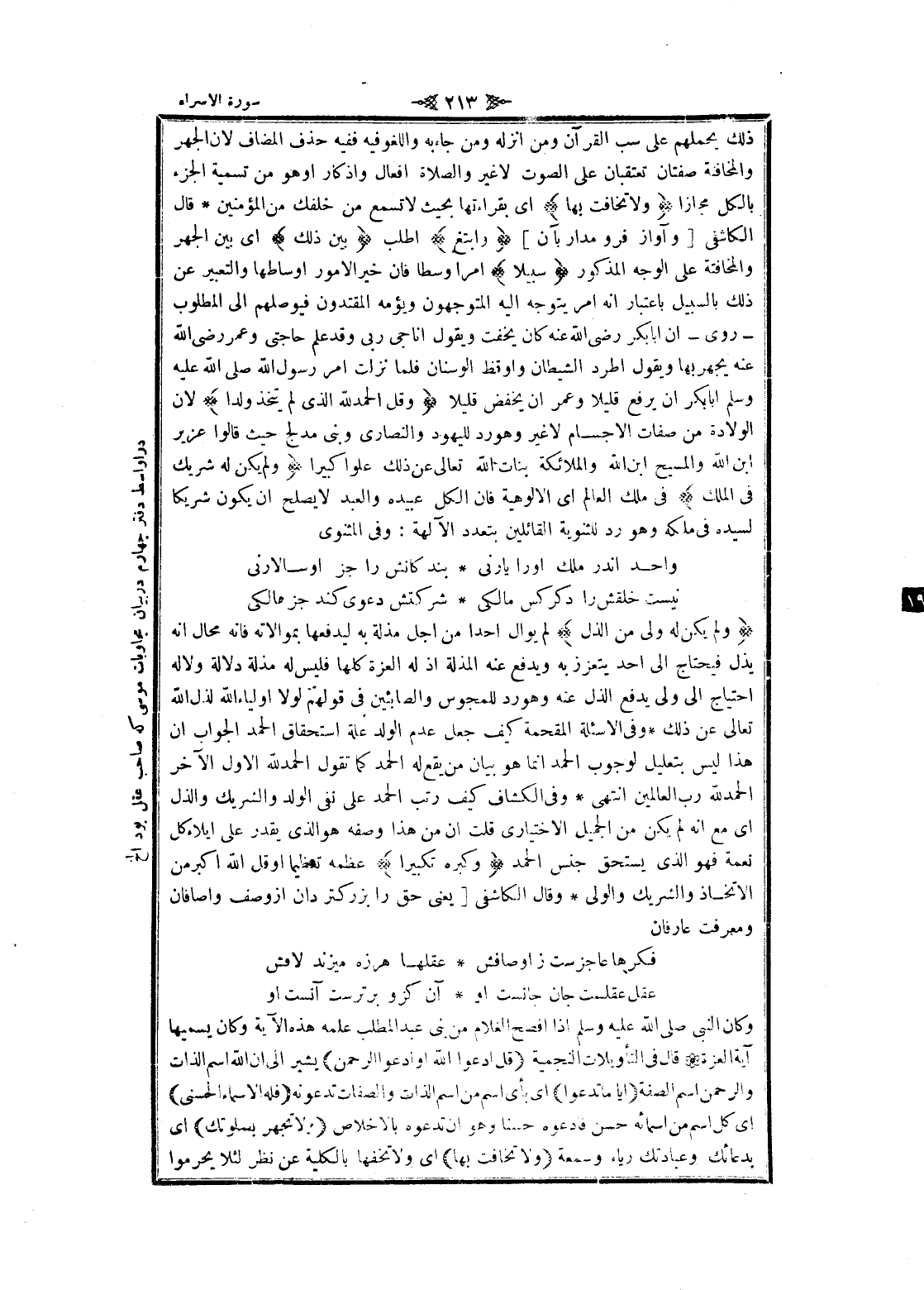 وكان النبي صلى الله عليه وسلم إذا افصح الغلام من بنى عبد المطلب علمه هذه الآية وكان يسميها آية العزة قال فى التأويلات النجمية قُلِ ادْعُوا اللَّهَ أَوِ ادْعُوا الرَّحْمنَ يشير الى ان الله اسم الذات والرحمن اسم الصفة أَيًّا ما تَدْعُوا اى بأى اسم من اسم الذات والصفات تدعونه فَلَهُ الْأَسْماءُ الْحُسْنى اى كل اسم من أسمائه حسن فادعوه حسنا وهو ان تدعوه بالإخلاص وَلا تَجْهَرْ بِصَلاتِكَ اى بدعائك وعبادتك رياء وسمعة وَلا تُخافِتْ بِها اى ولا تخفها بالكلية عن نظر لئلا يحرموا
