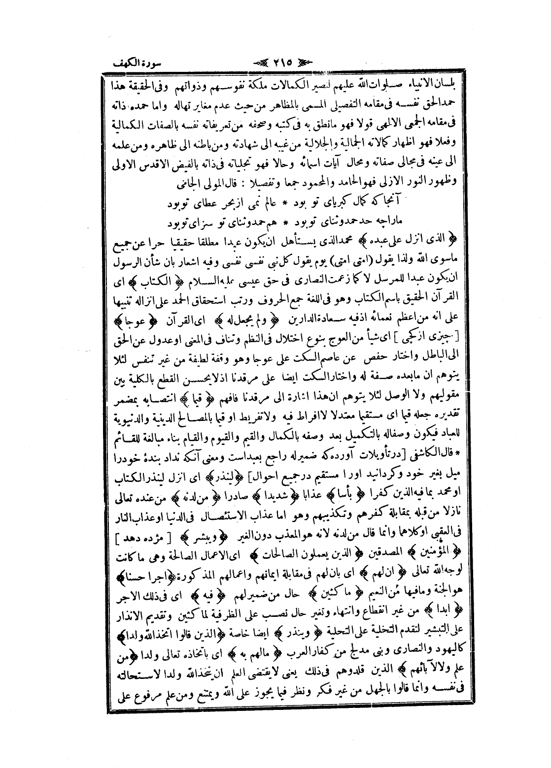 الَّذِي أَنْزَلَ عَلى عَبْدِهِ محمد الذي يستأهل ان يكون عبدا مطلقا حقيقيا حرا عن جميع ما سوى الله ولذا يقول (أمتي أمتي) يوم يقول كل نبى نفسى نفسى وفيه اشعار بان شأن الرسول ان يكون عبدا للمرسل لا كما زعمت النصارى فى حق عيسى عليه السلام الْكِتابَ اى القرآن الحقيق باسم الكتاب وهو فى اللغة جمع الحروف ورتب استحقاق الحمد على انزاله تنبيها على انه من أعظم نعمائه إذ فيه سعادة الدارين وَلَمْ يَجْعَلْ لَهُ اى القرآن عِوَجاً [چيزى از كچى] اى شيأ من العوج بنوع اختلال فى النظم وتناف فى المعنى او عدول عن الحق الى الباطل واختار حفص عن عاصم السكت على عوجا وهو وقفة لطيفة من غير تنفس لئلا يتوهم ان ما بعده صفة له واختار السكت ايضا على مرقدنا إذ لا يحسن القطع بالكلية بين مقوليهم ولا الوصل لئلا يتوهم ان هذا اشارة الى مرقدنا فانهم قَيِّماً انتصابه بمضمر تقديره جعله قيما اى مستقيما معتدلا لا افراط فيه ولا تفريط او قيما بالمصالح الدينية والدنيوية للعباد فيكون وصفاله بالتكميل بعد وصفه بالكمال والقيم والقيوم والقيام بناء مبالغة للقائم قال الكاشفى [در تأويلات آورده كه ضمير له راجع بعبد است ومعنى آنكه نداد بنده خود را ميل بغير خود وكردانيد او را مستقيم در جميع احوال] لِيُنْذِرَ اى انزل لينذر الكتاب او محمد بما فيه الذين كفرا بَأْساً عذابا شَدِيداً صادرا مِنْ لَدُنْهُ من عنده تعالى نازلا من قبله بمقابلة كفرهم وتكذيبهم وهو اما عذاب الاستئصال فى الدنيا او عذاب النار فى العقبى او كلاهما وانما قال من لدنه لانه هو المعذب دون الغير وَيُبَشِّرَ [مژده دهد] الْمُؤْمِنِينَ المصدقين الَّذِينَ يَعْمَلُونَ الصَّالِحاتِ اى الأعمال الصالحة وهى ما كانت لوجه الله تعالى أَنَّ لَهُمْ اى بان لهم فى مقابلة ايمانهم وأعمالهم المذكورة أَجْراً حَسَناً هو الجنة وما فيها من النعيم ماكِثِينَ حال من ضمير لهم فِيهِ اى فى ذلك الاجر أَبَداً من غير انقطاع وانتهاء وتغير حال نصب على الظرفية لما كثين وتقديم الانذار على التبشير لتقدم التخلية على التحلية وَيُنْذِرَ ايضا خاصة الَّذِينَ قالُوا اتَّخَذَ اللَّهُ وَلَداً كاليهود والنصارى وبنى مدلج من كفار العرب ما لَهُمْ بِهِ اى باتخاذه تعالى ولدا مِنْ عِلْمٍ وَلا لِآبائِهِمْ الذين قلدوهم فى ذلك يعنى لا يقتضى العلم ان يتخذ الله ولدا لاستحالته فى نفسه وانما قالوا بالجهل من غير فكر ونظر فيما يجوز على الله ويمتنع ومن علم مرفوع على