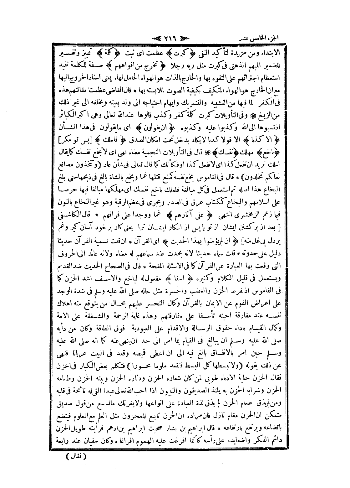 الابتداء ومن مزيدة لتأكيد النفي كَبُرَتْ عظمت اى نبت كَلِمَةً تمييز وتفسير للضمير المبهم الذهني فى كبرت مثل ربه رجلا تَخْرُجُ مِنْ أَفْواهِهِمْ صفة للكلمة تفيد استعظام اجترائهم على التفوه بها والخارج بالذات هو الهواء الحامل لها. يعنى اسناد الخروج إليها مع ان الخارج هو الهواء المتكيف بكيفية الصوت لملابسته بها قال القاضي عظمت مقالتهم هذه فى الكفر لما فيها من التشبيه والتشريك وإيهام احتياجه الى ولد بعينه ويخلفه الى غير ذلك من الزيغ وفى التأويلات كبرت كلمة كفر وكذب قالوها عند الله تعالى وهى اكبر الكبائر إذ نسبوها الى الله وكذبوا عليه وكذبوه إِنْ يَقُولُونَ اى ما يقولون فى هذا الشأن إِلَّا كَذِباً الا قولا كذبا لا يكاد يدخل تحت إمكان الصدق فَلَعَلَّكَ [پس تو مكر] باخِعٌ مهلك نَفْسَكَ قال فى التأويلات النجمية معناه نهى اى لا تنجع نفسك كما يقال لعلك تريد ان تفعل كذا اى لا تفعل كذا او فكأنك كما قال تعالى فى شأن عاد وَتَتَّخِذُونَ مَصانِعَ لَعَلَّكُمْ تَخْلُدُونَ قال فى القاموس بخع نفسه كمنع قتلها غما وبخع بالشاة بالغ فى ذبحها حتى بلغ البخاع هذا أصله ثم استعمل فى كل مبالغة فلعلك باخع نفسك اى مهلكها مبالغا فيها حرصا على إسلامهم والبخاع ككتاب عرق فى الصدر ويجرى فى عظم الرقبة وهو غير النخاع بالنون فيما زعم الزمخشري انتهى عَلى آثارِهِمْ غما ووجدا على فراقهم قال الكاشفى [بعد از بركشتن ايشان از تو يا پس از انكار ايشان ترا يعنى كار بر خود آسان كير وغم بر دل بي غل منه] إِنْ لَمْ يُؤْمِنُوا بِهذَا الْحَدِيثِ اى القرآن ان قلت تسمية القرآن حديثا دليل على حدوثه قلت سماه حديثا لانه يحدث عند سماعهم له معناه ولانه عائد الى الحروف التي وقعت بها العبارة عن القرآن كما فى الاسئلة المقحمة قال فى الصحاح الحديث ضد القديم ويستعمل فى قليل الكلام وكثيره أَسَفاً مفعول له لباخع والأسف أشد الحزن كما فى القاموس إذ لفرط الحزن والغضب والحسرة مثل حاله صلى الله عليه وسلم فى شدة الوجد على اعراض القوم عن الايمان بالقرآن وكمال التحسر عليهم بحال من يتوقع منه إهلاك نفسه عند مفارقة أحبته تأسفا على مفارقتهم وهذه غاية الرحمة والشفقة على الامة وكمال القيام بأداء حقوق الرسالة والاقدام على العبودية فوق الطاقة وكان من دأبة صلى الله عليه وسلم ان يبالغ فى القيام بما امر الى حد ان ينهى عنه كما انه صلى الله عليه وسلم حين امر بالإنفاق بالغ فيه الى ان اعطى قميصه وقعد فى البيت عريانا فنهى عن ذلك بقوله وَلا تَبْسُطْها كُلَّ الْبَسْطِ فَتَقْعُدَ مَلُوماً مَحْسُوراً فتكلم بعض الكبار فى الحزن فقال الحزن حلية الأدباء طوبى لمن كان شعاره الحزن ودثاره الحزن وبيته الحزن وطعامه الحزن وشرابه الحزن به يلتذ الصديقون والنبيون إذا أحب الله تعالى عبدا القى له نائحة فى قلبه ومن لم يذق طعام الحزن لم يذق لذة العبادة على أنواعها ولا يغرنك ما تسمع من قول صديق متمكن ان الحزن مقام نازل فان مراده ان الحزن تابع للمحزون مثل العلم مع المعلوم فيتضع باتضاعه ويرتفع بارتفاعه قال ابراهيم بن باشر صحبت ابراهيم بن أدهم فرأيته طويل الحزن دائم الفكر واضعا يده على رأسه كأنما أفرغت عليه الهموم إفراغا وكان سفيان عند رابعة