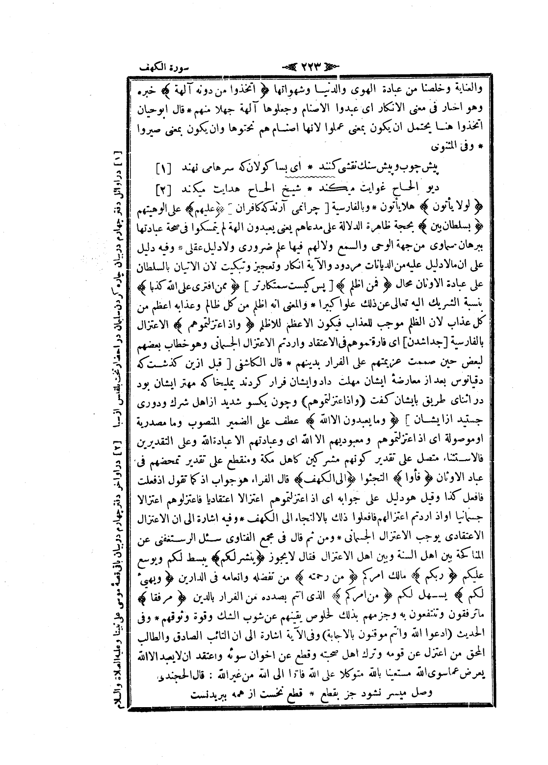 لَوْلا يَأْتُونَ هلا يأتون وبالفارسية [چرا نمى آرند كه كافران] عَلَيْهِمْ على الوهيتهم بِسُلْطانٍ بَيِّنٍ بحجة ظاهرة الدلالة على مدعاهم يعنى يعبدون الهة لم يتمسكوا فى صحة عبادتها ببرهان سماوى من جهة الوحى والسمع ولا لهم فيها علم ضرورى ولا دليل عقلى وفيه دليل على ان ما لا دليل عليه من الديانات مردود والآية انكار وتعجيز وتبكيت لان الإتيان بالسلطان على عبادة الأوثان محال فَمَنْ أَظْلَمُ [پس كيست ستمكارتر] مِمَّنِ افْتَرى عَلَى اللَّهِ كَذِباً بنسبة الشريك اليه تعالى عن ذلك علوا كبيرا والمعنى انه اظلم من كل ظالم وعذابه أعظم من كل عذاب لان الظلم موجب للعذاب فيكون الأعظم للاظلم وَإِذِ اعْتَزَلْتُمُوهُمْ الاعتزال بالفارسية [جدا شدن] اى فارقتموهم فى الاعتقاد وأردتم الاعتزال الجسماني وهو خطاب بعضهم لبعض حين صممت عزيمتهم على الفرار بدينهم قال الكاشفى [قبل ازين كذشت كه دقيانوس بعد از معارضه ايشان مهلت داد وايشان فرار كردند يمليخا كه مهتر ايشان بود در اثناى طريق بايشان كفت وَإِذِ اعْتَزَلْتُمُوهُمْ و چون يكسو شديد از اهل شرك ودورى جستيد از ايشان] وَما يَعْبُدُونَ إِلَّا اللَّهَ عطف على الضمير المنصوب وما مصدرية او موصولة اى إذ اعتزلتموهم ومعبوديهم الا الله اى وعبادتهم الا عبادة الله وعلى التقديرين فالاستثناء متصل على تقدير كونهم مشركين كاهل مكة ومنقطع على تقدير تمحضهم فى عباد الأوثان فَأْوُوا التجئوا إِلَى الْكَهْفِ قال الفراء هو جواب إذ كما تقول إذ فعلت فافعل كذا وقيل هو دليل على جوابه اى إذ اعتزلتموهم اعتزالا اعتقاديا فاعتزلوهم اعتزالا جسمانيا او إذ أردتم اعتزالهم فافعلوا ذلك بالالتجاء الى الكهف وفيه اشارة الى ان الاعتزال الاعتقادى يوجب الاعتزال الجسماني ومن ثم قال فى مجمع الفتاوى سئل الرستغفنى عن المناكحة بين اهل السنة وبين اهل الاعتزال فقال لا يجوز يَنْشُرْ لَكُمْ يبسط لكم ويوسع عليكم رَبُّكُمْ مالك أمركم مِنْ رَحْمَتِهِ من تفضله وانعامه فى الدارين وَيُهَيِّئْ لَكُمْ يسهل لكم مِنْ أَمْرِكُمْ الذي أنتم بصدده من الفرار بالدين مِرفَقاً ما ترفقون وتنتفعون به وجزمهم بذلك لخلوص يقينهم عن شوب الشك وقوة وثوقهم وفى الحديث (ادعوا الله وأنتم موقنون بالاجابة) وفى الآية اشارة الى ان التائب الصادق والطالب المحق من اعتزل عن قومه وترك اهل صحبته وقطع عن اخوان سوئه واعتقد ان لا يعبد الا الله يعرض عما سوى الله مستعينا بالله متوكلا على الله فارّا الى الله من غير الله: قال الخجندي
