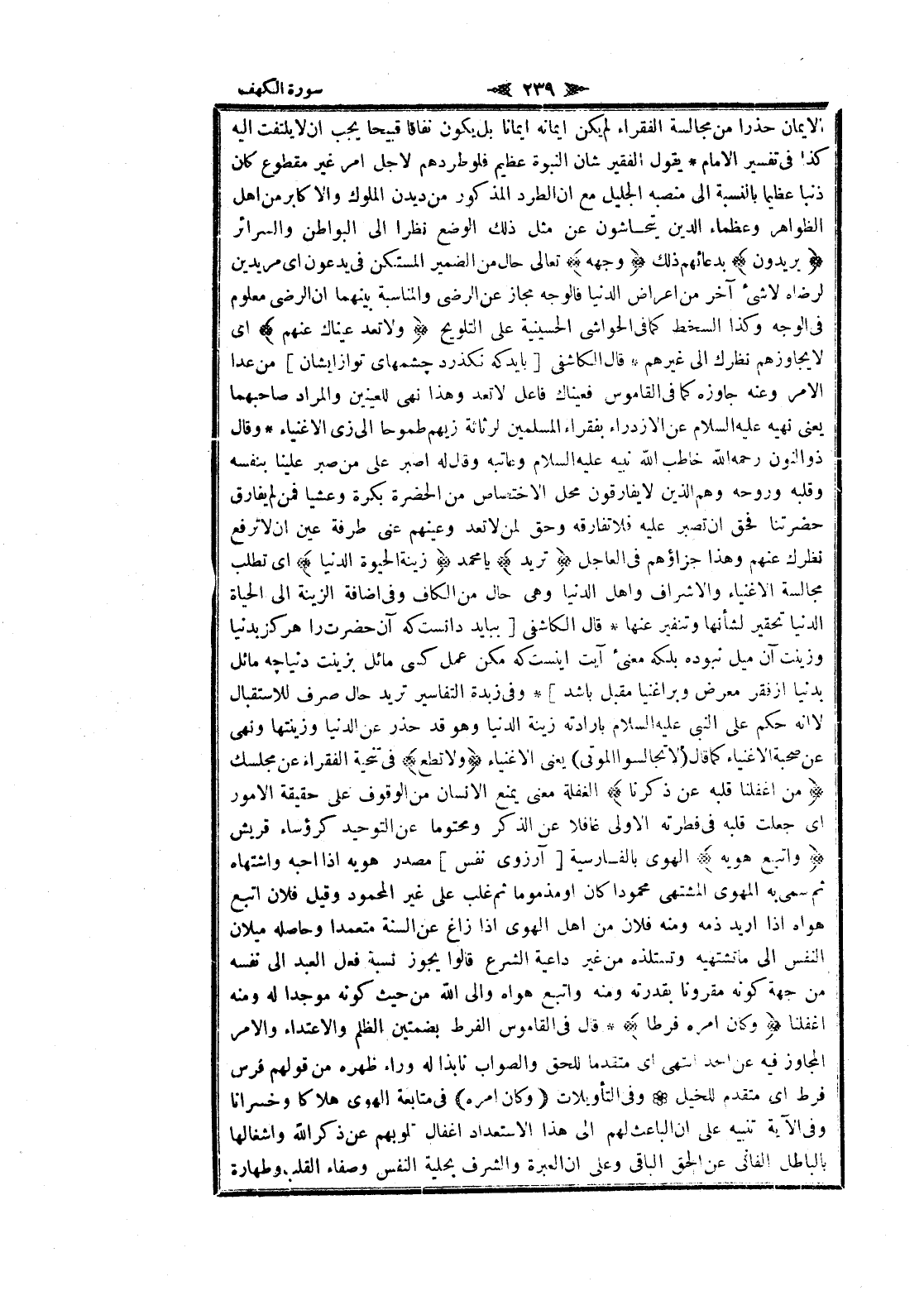 الايمان حذرا من مجالسة الفقراء لم يكن إيمانه ايمانا بل يكون نفاقا قبيحا يجب ان لا يلتفت اليه كذا فى تفسير الامام يقول الفقير شان النبوة عظيم فلو طردهم لاجل امر غير مقطوع كان ذنبا عظيما بالنسبة الى منصبه الجليل مع ان الطرد المذكور من ديدن الملوك والا كابر من اهل الظواهر وعظماء الدين يتحاشون عن مثل ذلك الوضع نظرا الى البواطن والسرائر يُرِيدُونَ بدعائهم ذلك وَجْهَهُ تعالى حال من الضمير المستكن فى يدعون اى مريدين لرضاه لا شىء آخر من اعراض الدنيا فالوجه مجاز عن الرضى والمناسبة بينهما ان الرضى معلوم فى الوجه وكذا السخط كما فى الحواشي الحسينية على التلويح وَلا تَعْدُ عَيْناكَ عَنْهُمْ اى لا يجاوزهم نظرك الى غيرهم قال الكاشفى [بايد كه نكذرد چشمهاى تو از ايشان] من عدا الأمر وعنه جاوزه كما فى القاموس فعيناك فاعل لا تعد وهذا نهى للعينين والمراد صاحبهما يعنى نهيه عليه السلام عن الازدراء بفقراء المسلمين لرثاثة زيهم طموحا الى زى الأغنياء وقال ذو النون رحمه الله خاطب الله نبيه عليه السلام وعاتبه وقال له اصبر على من صبر علينا بنفسه وقلبه وروحه وهم الذين لا يفارقون محل الاختصاص من الحضرة بكرة وعشيا فمن لم يفارق حضرتنا فحق ان تصبر عليه فلا تفارقه وحق لمن لا تعد وعينهم عنى طرفة عين ان لا ترفع نظرك عنهم وهذا جزاؤهم فى العاجل تُرِيدُ يا محمد زِينَةَ الْحَياةِ الدُّنْيا اى تطلب مجالسة الأغنياء والاشراف واهل الدنيا وهى حال من الكاف وفى اضافة الزينة الى الحياة الدنيا تحقير لشأنها وتنفير عنها قال الكاشفى [ببايد دانست كه آن حضرت را هركز بدنيا وزينت آن ميل نبوده بلكه معنئ آيت اينست كه مكن عمل كسى مائل بزينت دنيا چهـ مائل بدنيا از فقر معرض وبر اغنيا مقبل باشد] وفى زبدة التفاسير تريد حال صرف للاستقبال لا انه حكم على النبي عليه السلام بإرادته زينة الدنيا وهو قد حذر عن الدنيا وزينتها ونهى عن صحبة الأغنياء كما قال (لا تجالسوا