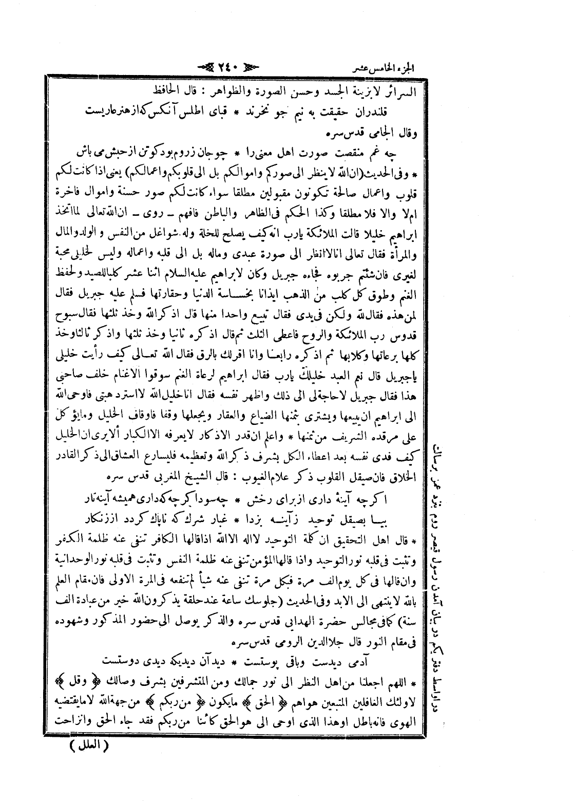 وفى الحديث (ان الله لا ينظر الى صوركم وأموالكم بل الى قلوبكم وأعمالكم) يعنى إذا كانت لكم قلوب واعمال صالحة تكونون مقبولين مطلقا سواء كانت لكم صور حسنة واموال فاخرة أم لا والا فلا مطلقا وكذا الحكم فى الظاهر والباطن فافهم- روى- ان الله تعالى لما اتخذ ابراهيم خليلا قالت الملائكة يا رب انه كيف يصلح للخلة وله شواغل من النفس والولد والمال والمرأة فقال تعالى انا لا انظر الى صورة عبدى وما له بل الى قلبه واعماله وليس لخليلى محبة لغيرى فان شئتم جربوه فجاءه جبريل وكان لابراهيم عليه السلام اثنا عشر كلبا للصيد ولحفظ الغنم وطوق كل كلب من الذهب إيذانا بخساسة الدنيا وحقارتها فسلم عليه جبريل فقال لمن هذه فقال لله ولكن فى يدى فقال تبيع واحدا منها قال اذكر الله وخذ ثلثها فقال سبوح قدوس رب الملائكة والروح فاعطى الثلث ثم قال اذكره ثانيا وخذ ثلثها واذكر ثالثا وخذ كلها برعاتها وكلابها ثم اذكره رابعا وانا أقر لك بالرق فقال الله تعالى كيف رأيت خليلى يا جبريل قال نعم العبد خليلك يا رب فقال ابراهيم لرعاة الغنم سوقوا الأغنام خلف صاحبى هذا فقال جبريل لا حاجة لى الى ذلك واظهر نفسه فقال انا خليل الله لا استرد هبتى فاوحى الله الى ابراهيم ان يبيعها ويشترى بثمنها الضياع والعقار ويجعلها وقفا فاوقاف الخليل وما يؤكل على مرقده الشريف من ثمنها واعلم ان قدر الاذكار لا يعرفه الا الكبار ألا يرى ان الخليل كيف فدى نفسه بعد إعطاء الكل بشرف ذكر الله وتعظيمه فليسارع العشاق الى ذكر القادر الخلاق فان صيقل القلوب ذكر علام الغيوب: قال الشيخ المغربي قدس سره